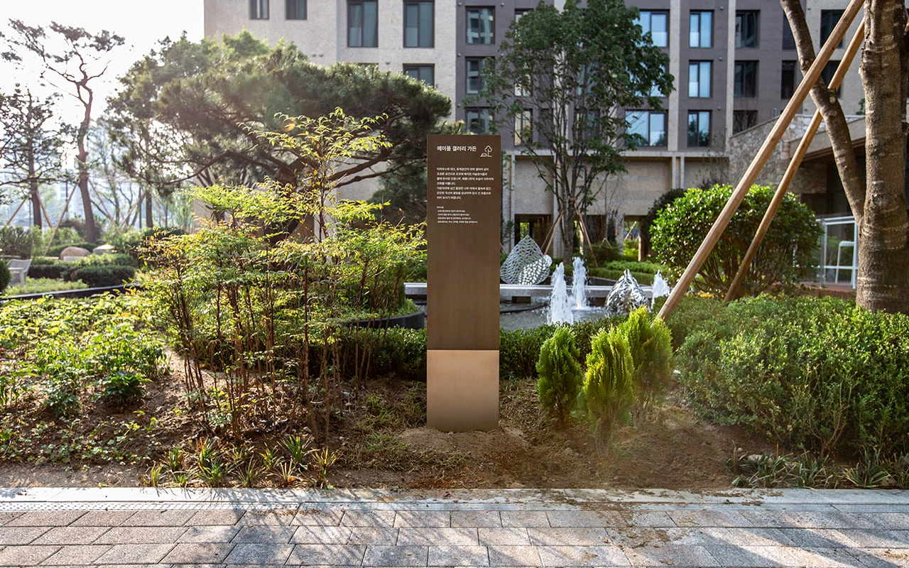 단지를 거닐다 보면 눈에 들어오는 수많은 표식들이 있다. 이곳이 몇 동인지 알려주는 숫자, 단지 내 주요 시설을 안내해주는 지도, 조경 공간의 꽃과 나무에 대한 이름표와 설명들까지. 모두 공간의 정보를 전달하는 표기들, 바로 ‘사이니지(Signage)’다.