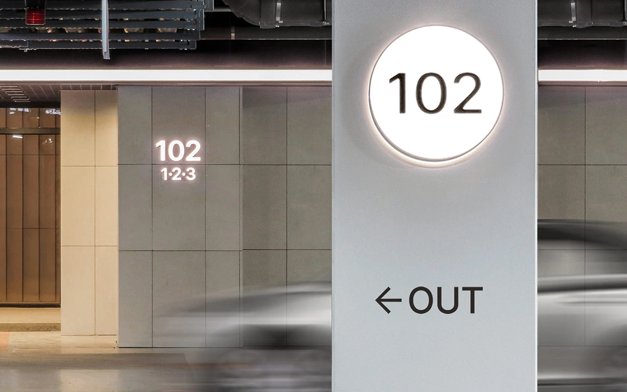일관된 경험이 유지되도록 지상 공간과 지하 주차장의 사이니지를 일체화 하는 것은 물론, 나아가 지하 주차장의 사이니지는 보행자에게 안전한 계획이길 의도했다. 그리고 사이니지를 단순히 ‘길을 찾는 표식’이 아니라 공간의 분위기와 정서를 함께 설계하는 요소로서 바라보았다. 문라이트(MOON LIGHT)는 그런 철학이 담긴 디자인이다.