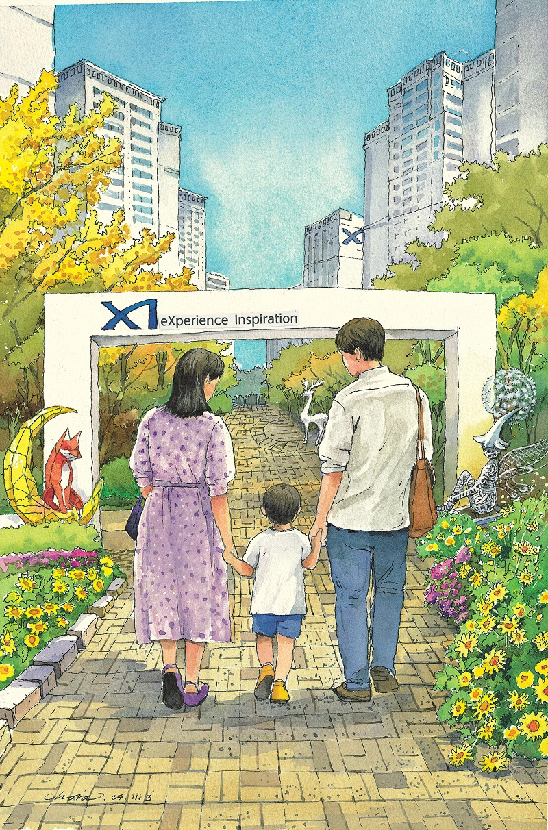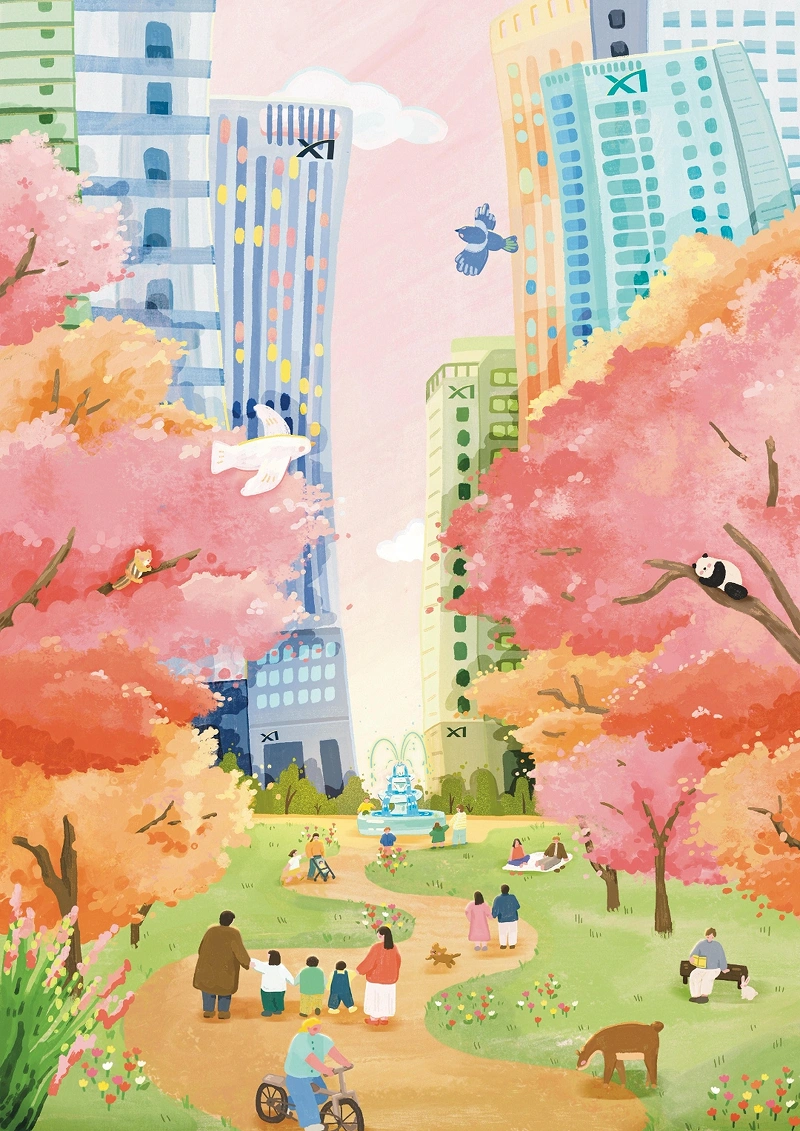 도심에서도 자연과 함께 숨 쉬는 자이의 풍경이 이번 작업의 출발점이었어요. 아이들의 눈에는 잘 꾸며진 조경과 단지 환경이 마치 하나의 동화처럼 보이지 않을까 하는 상상을 더하며 그 시선을 그림에 담았습니다. 작품 속 여러 가족의 모습이 일상의 따뜻함을 전하고, 자이가 지향하는 삶의 가치도 자연스럽게 드러나길 바랐어요. 이번 작업을 통해 상상이 실제 공간과 만나는 즐거움을 느꼈고, 언젠가 그림 속 풍경에서 살아보고 싶다는 바람도 생겼습니다. 작품을 보는 분들에게 동화 속에 머무는 듯한 행복감이 전해지길 바랍니다.