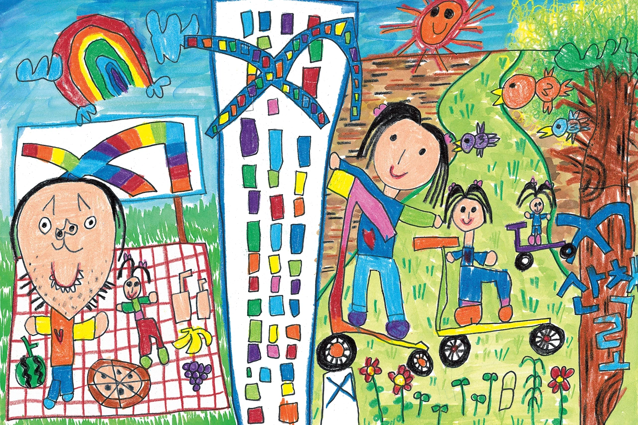 제가 사는 자이 아파트 잔디밭이랑 길을 그렸어요. 가족이랑 친구들이 같이 놀 수 있는 피크닉 자리도 만들었고요. 지금은 겨울이라 밖에 오래 못 나가지만 봄이 오면 엄마, 아빠랑 잔디밭에서 소풍을 즐기고 싶어요. 그림에는 제가 좋아하는 친구들 그리고 엄마, 아빠와 놀던 모습을 그렸어요. 상을 받았다고 들었을 때 “엄마, 이 상 좋은 거예요?” 하고 물어봤어요. 상을 받아서 기분이 좋았거든요. 엄마 아빠도 잘 그렸다고 많이 칭찬해 주셨어요!