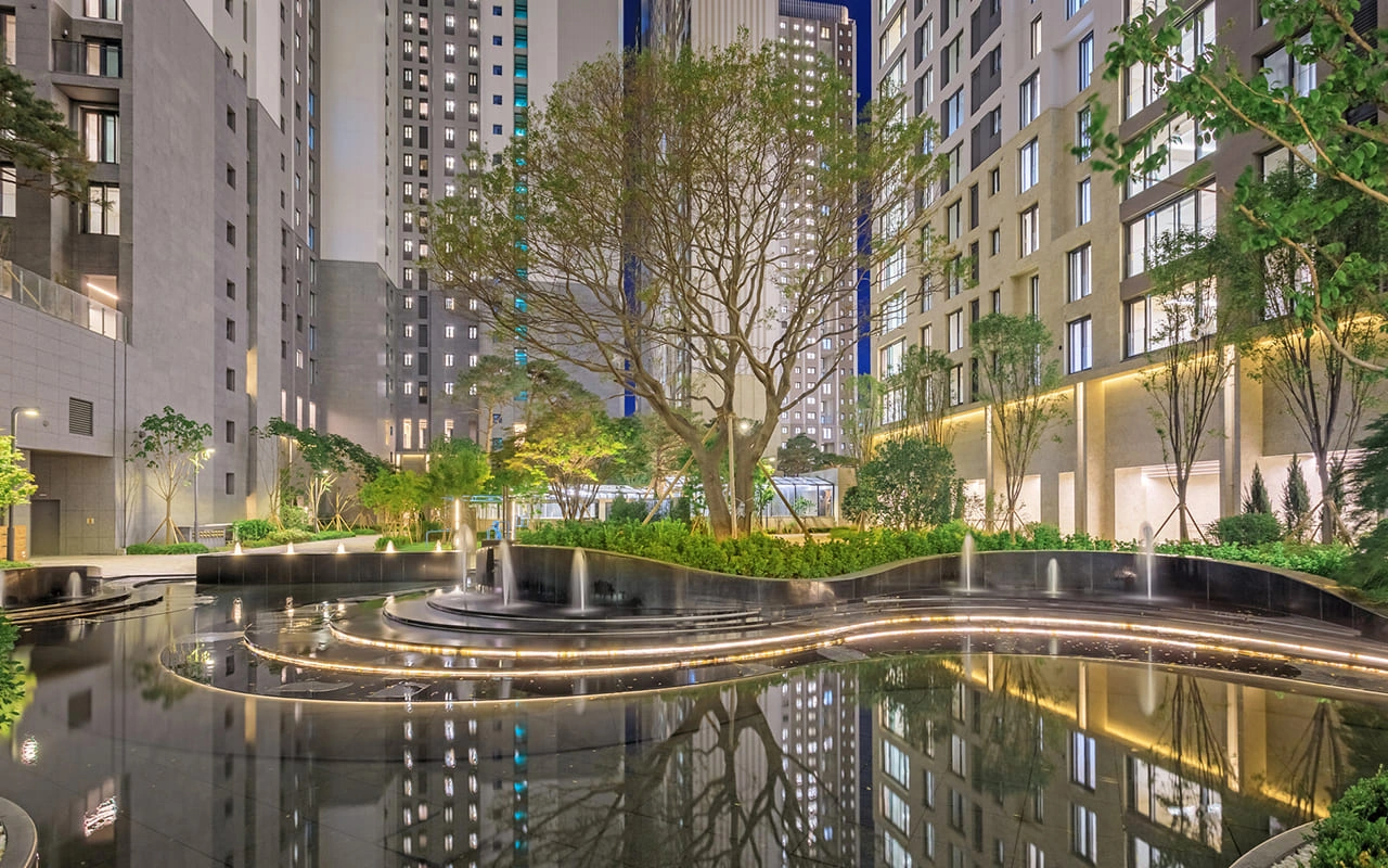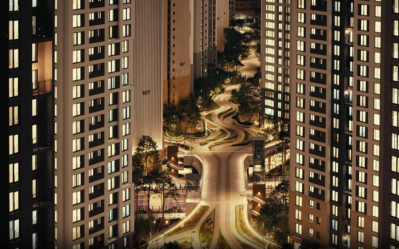 “입주민의 삶과 자연의 배경이 되는 외관 디자인을 통해, 자이로 인해 아름다워지는 도시 경관을 만드는 것이 저희의 기본 철학이자 목표였습니다. 따뜻한 색감의 조명이 조형물의 섬세한 디테일과 어우러져 도시 경관을 한층 품격 있게 끌어올리며, 입주민들이 지하와 하부 공간에서도 자연의 리듬을 경험하고, 하루의 변화를 빛으로 체감하길 바랐습니다.” – GS건설 외관 디자인 담당 서명회