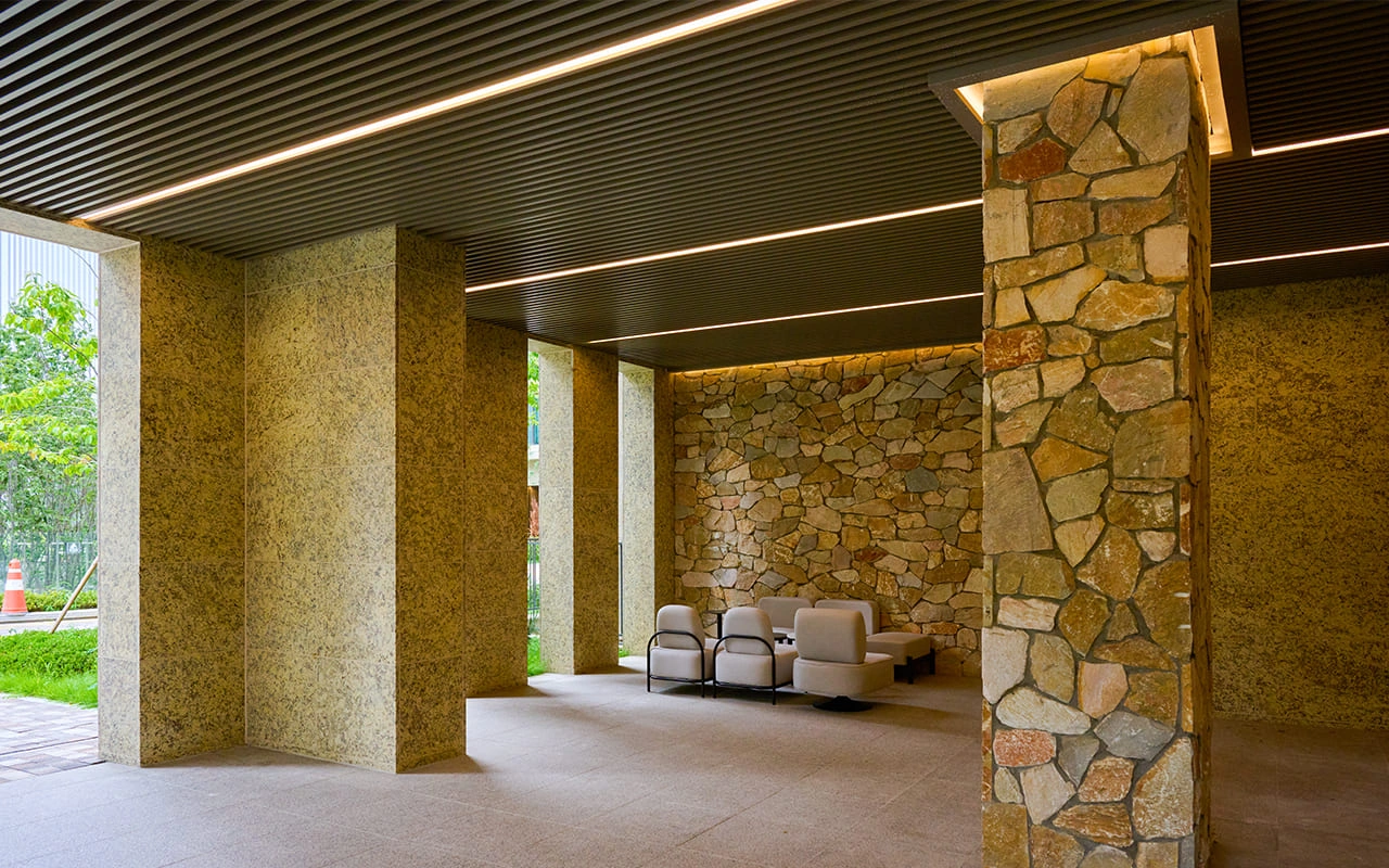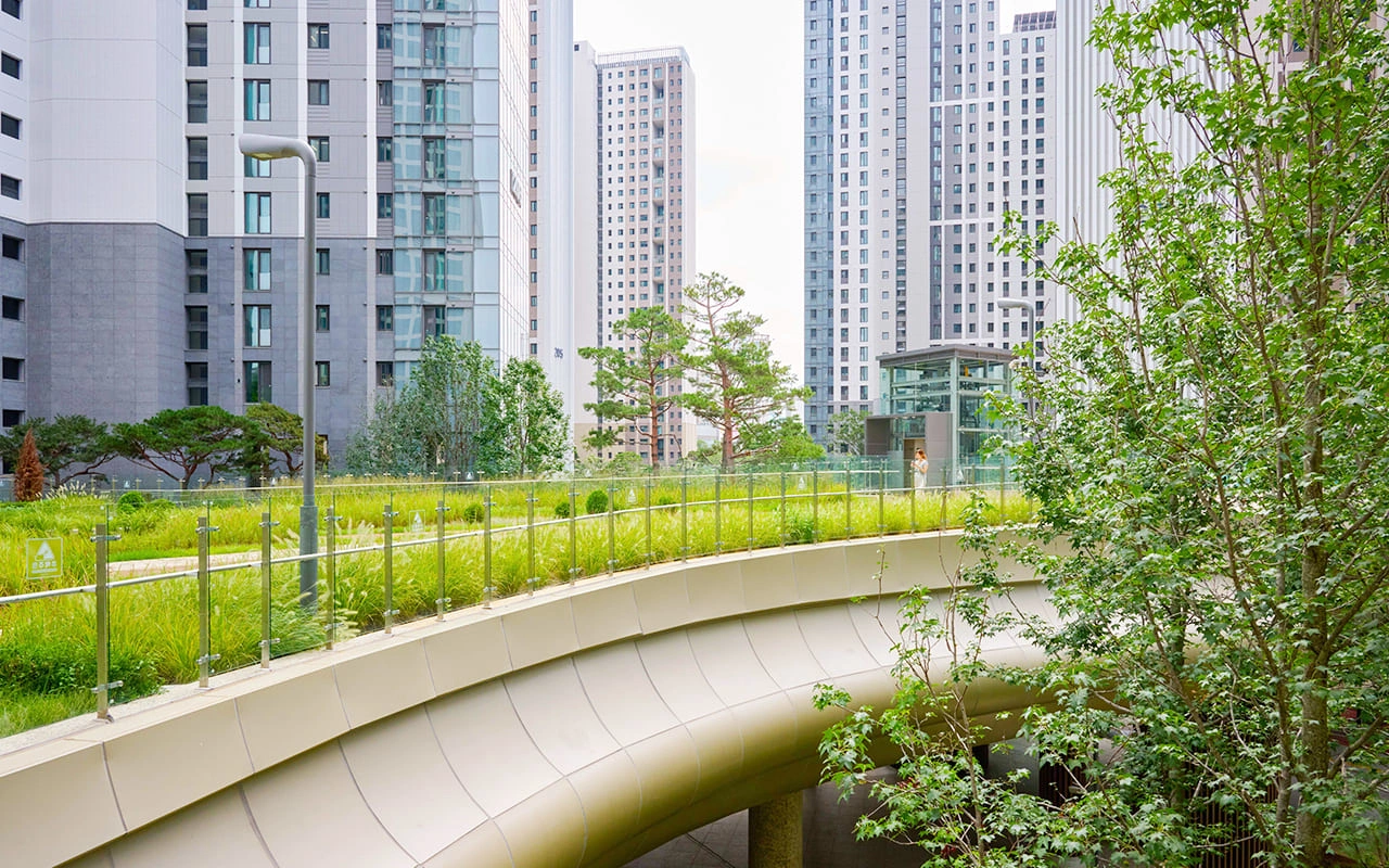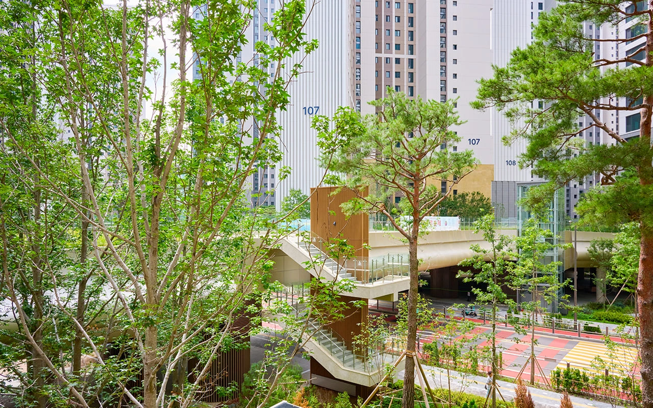 특히 지하 주차장은 자연광이 스며드는 선큰 구조로 설계돼, 일반적인 지하 공간의 폐쇄감을 줄였다. 빛은 공간을 밝히는 동시에, 출입구를 직관적으로 안내하는 자연스러운 길잡이가 되었다. 테라코타의 질감과 빛이 만나 지하에도 부드러운 음영을 만들고, 저녁에는 ‘월 그레이저’ 조명으로 밤에도 낮처럼 따뜻한 빛의 리듬을 이어간다. 이 빛은 하루의 변화를 품은 또 하나의 자연이며, 입주민은 그 안에서 시간이 흐르는 감성의 공간을 경험한다.
