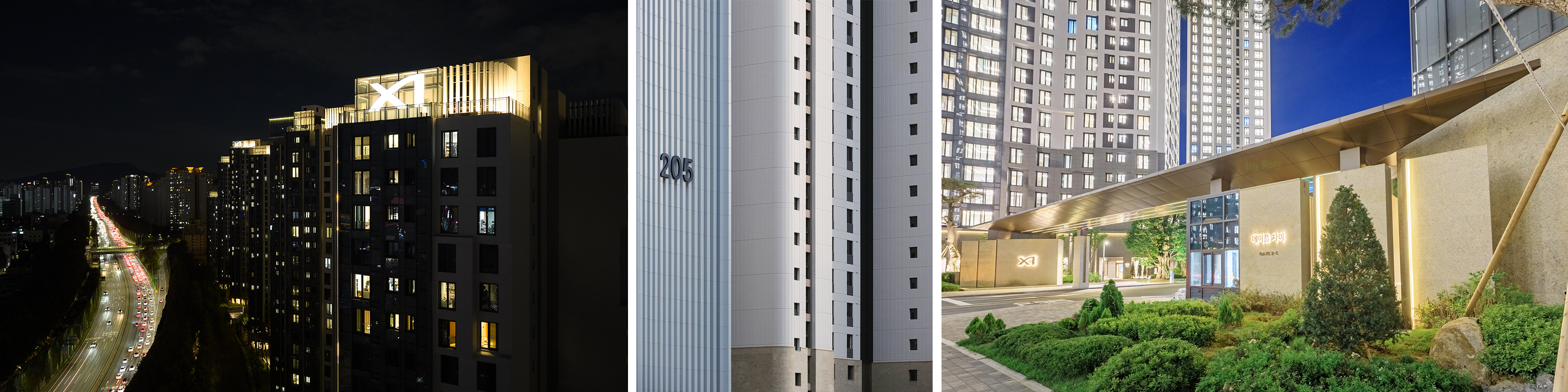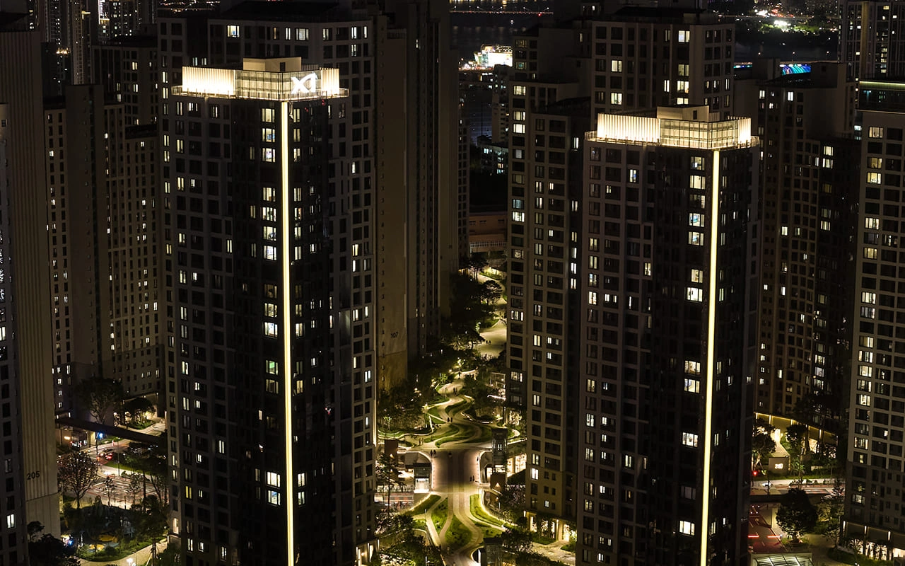 경부고속도로변을 마주한 입지에서 가장 먼저 보이는 것은 도시의 실루엣, 그리고 자이의 빛이다. 야경의 품격을 높이기 위해 옥탑과 측벽 조형물에 지속 가능한 경관조명을 설계했다. 타원형 루버가 만들어내는 부드러운 빛의 흐름, 곡면 루버로 표현한 입체적 그라데이션, 그 따뜻한 조명은 도시의 밤을 물들이며, 입주민의 자부심을 빛으로 드러내는 상징이 되었다.
