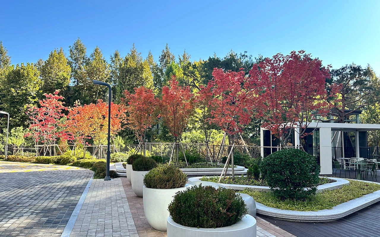 ‘메이플자이’라는 이름 그대로, 단풍은 단지 조경의 핵심 모티프이자 기억의 상징이다. 오랫동안 이곳의 주요 수종이었던 단풍의 풍경을 되살리기 위해 자이는 단지를 조성하기 7년 전부터 에버랜드 농장과 협약을 맺고 단풍나무를 직접 재배했다. 그 결과 어텀 블레이즈, 루브룸, 레드선셋, 고로쇠 등 다양한 수종이 어우러진 ‘단풍 숲’이 조성되었다. 입주민들은 그 속에서 산책하고, 아이들과 추억을 만들며, ‘사계절이 변화를 이야기하는 집 앞 정원’을 만나게 된다.