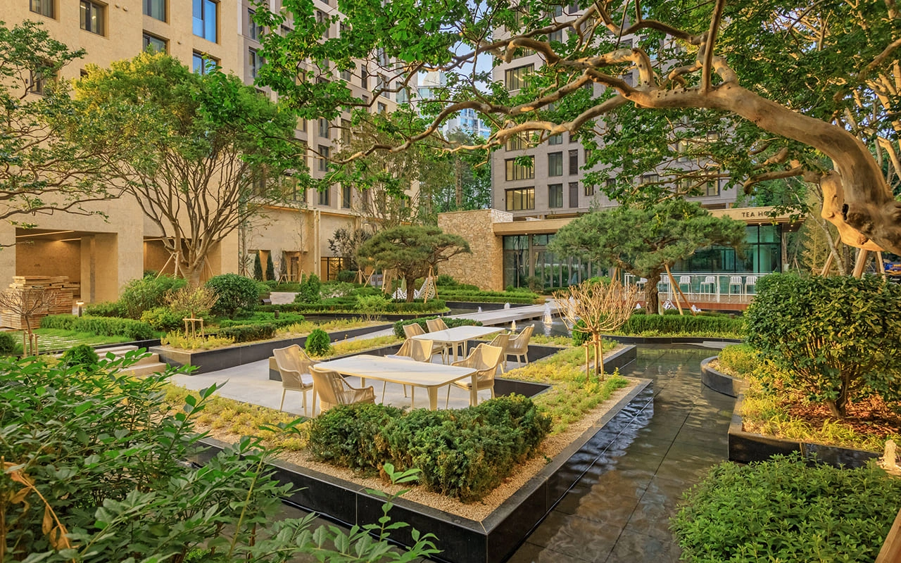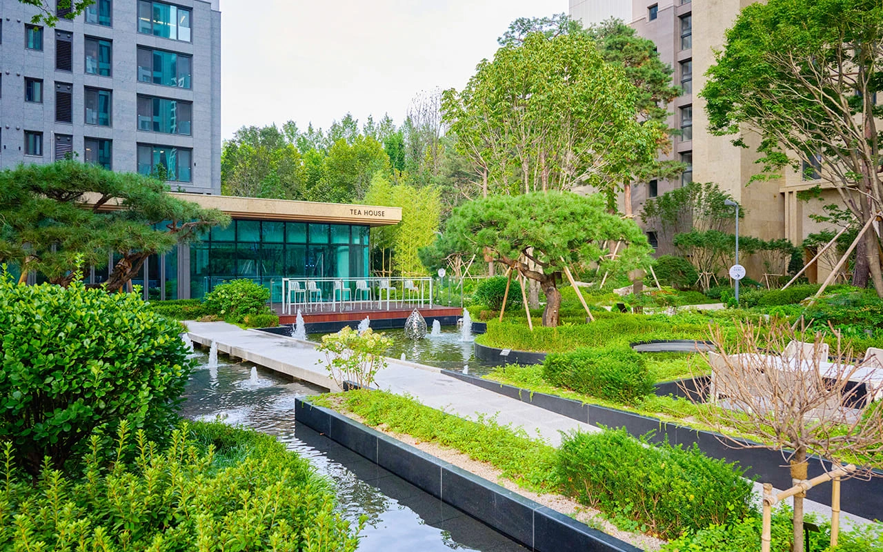 메이플자이는 하나의 대형 녹지 공간이 아닌, 크고 작은 정원들이 연결된 구조로 설계됐다. 단지 전역에 배치된 12개의 수경 공간은 물의 흐름을 이어가면서 자연의 리듬과 유사한 환경을 조성한다. 각 공간은 숲, 호수, 계곡 등 자연의 장면에서 모티프를 얻어 설계되었으며, 입주민은 이동 중에도 다양한 자연 경험을 접하게 된다.