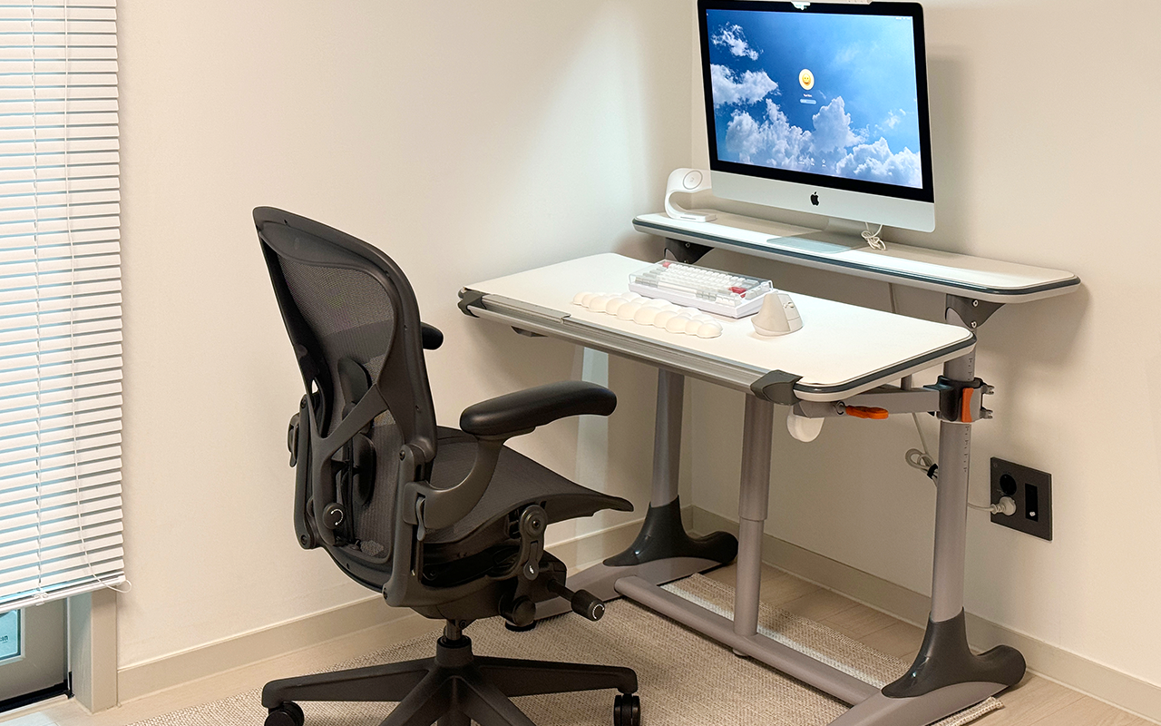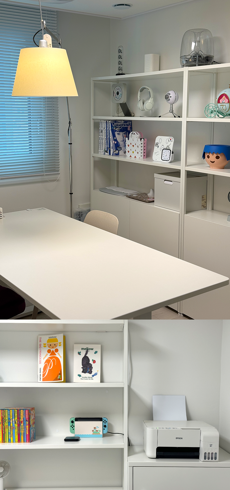 3년 전부터 우리 가족은 함께 식사하는 식탁 외에 가족 모두가 함께할 수 있는 공간을 만들어보자는 계획을 세웠답니다. 그래서 방 하나를 가족의 생활 패턴을 고려해 작업실 겸 공부방으로 만들었습니다. 가장 중요하게 고려한 사항은 사춘기가 시작한 아이의 의견 반영이었어요. 높이 조절이 자유로운 책상을 원해서 다양한 책상을 알아보고, 오프라인 매장 쇼룸을 방문하여 비교한 끝에 폭이 1,800mm나 되는 큰 책상으로 선택했어요. 그리고 제가 좋아하는 화이트 톤으로 공간을 연출했습니다.