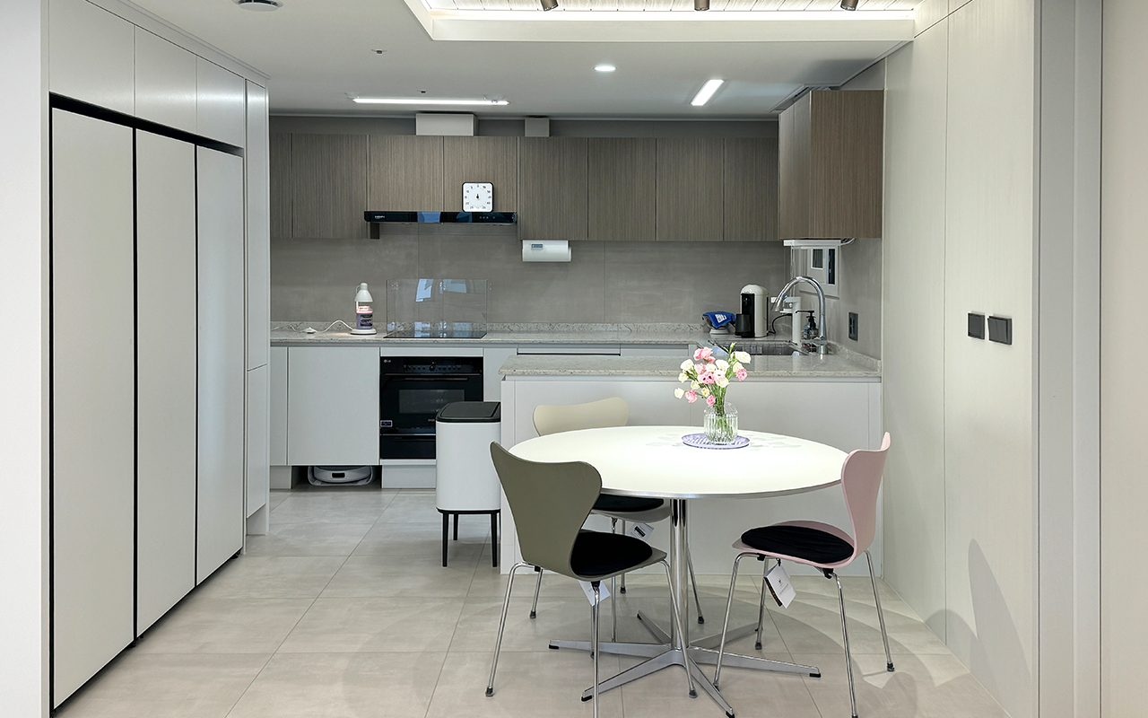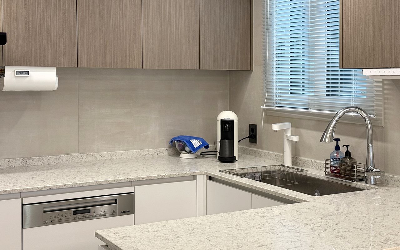 다른 타입과 다르게 주방이 길고 넓어 사용하기 편리한 구조로 되어 있는 우리 집 주방. 이 타입은 싱크대 정면에 난 창으로  바람길이 있어 맞통풍보다 더 강한 바람이 들어오고, 거실에서 봤을 때 창문이 안 보이니 오히려 깔끔해요. 아파트 구조를 설계할 때 이렇게까지 섬세했다니 하고 감탄할 정도입니다. 주방 상부장을 처음 보았을 때는 익숙하지 않아 ‘왜 떨어져 있지?’ ‘컬러는 이게 뭘까?’ 생각했는데, 요즘 인테리어 트렌드를 아시나요? 상부장이 천장에서 살짝 떨어져 있어요. 직접 사용해 보니 답답함도 없고, 디자인적으로도 시각적으로 편안하답니다. 또한 상부장과 유럽산 대형 포셀린 타일의 벽 덕분에 컬러의 흐름도 자연스럽게 이어지는 것 같아요.