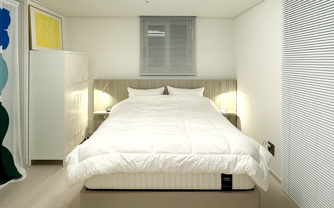 부부의 공간은 호텔처럼 꾸며보고 싶었어요. 그래서 긴 구조와 창문의 위치를 살려 제 나름대로 가구를 배치하고, 알루미늄 블라인드를 사용하여 인테리어했습니다. 안방이 워낙 길다 보니 침대와 드레스룸 맞은편에 가벽을 설치하고 싶었지만, 생각을 바꿔 개방감 있게 책상만 배치하기로 했답니다. 원래 책상 상판의 컬러는 우드였는데요, 화이트 컬러로 리폼해서 톤을 맞췄어요. 이렇게 저만의 작은 서재가 완성되었죠. 인테리어 팁을 공유하자면, 침구 및 가구의 톤을 맞추고 이불 정리를 잘하면 공간이 깨끗해 보이고 정리 정돈이 잘되어 보입니다. 정말 단순하죠.
