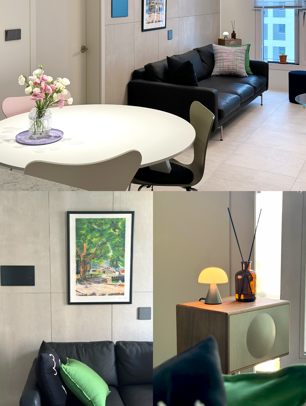 ‘우리가 선택한 라이트 톤과 벽 마감을 살려 어떻게 공간을 꾸며볼까?’ ‘가구는 어떤 컬러와 소재로 선택할까?’ 부단한 고민한 결과물이 바로 다이닝 공간이에요. 거실 혹은 주방에 위치를 옮겨가며 장식한 꽃은 늘 기분 좋게 유지해 주고, 그림 구독 서비스를 통해 매달 바뀌는 그림은 인테리어 포인트로 활용합니다. 원형 식탁은 주방에서 거실로 이어지는 공간을 더 부드럽고 유니크하게 만드는 데 큰 역할을 하고 있죠. 또한 빛에 따라 달라 보이는 벽면의 느낌을 살려, 블랙 소파와 쿠션으로 포인트를 주었어요. 스피커와 작은 조명, 디퓨저로도 분위기를 내 보았답니다.