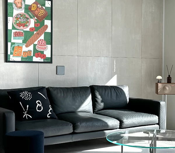 벽의 타일이 아닌 부분은 시트 패널로 마감했는데요, 이렇게 하니 별도로 인테리어 시공한 느낌을 주었어요. 또 거실에서 가장 많이 신경 쓴 부분은 줄눈이에요. 유광보다는 무광, 그중에서도 케라폭시 줄눈을 선택해서 분위기를 맞췄습니다. 무광은 아무래도 음식물을 흘리거나 하면 오염되는 게 걱정이잖아요. 케라폭시 줄눈은 무광 중에서도 오염에 아주 강한 줄눈이라 안심이에요.