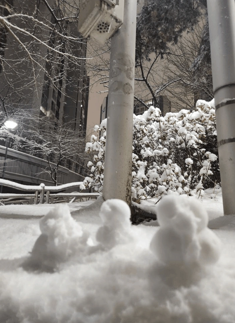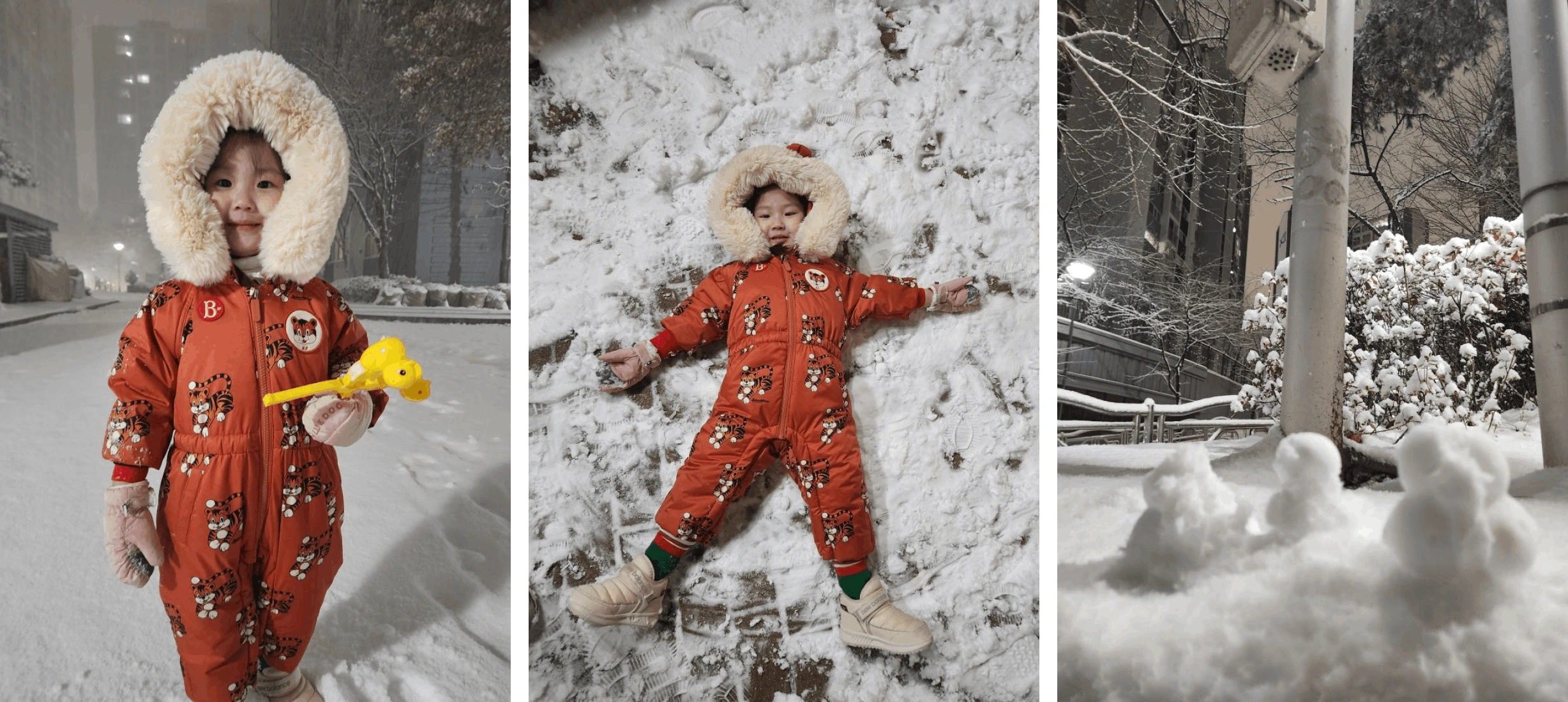 올해 첫눈을 네 살배기 막내와 함께 온몸으로 만끽했습니다. 단지가 온통 눈으로 덮인 순간, 아무도 밟지 않은 하얀 길을 사박사박 걸으며 아이와 함께 환호성을 질렀죠. 원래는 함께 눈사람을 만들려고 했는데, 너무 신이 난 아이는 그냥 눈 속으로 돌진하더군요. 마음껏 뒹굴며 눈을 즐겨본 게 얼마 만인지요? 이내 단지 내 다른 아이들도 하나 둘 모여들어 눈 오리도 만들고, 눈사람도 세우며 즐거운 시간이 이어졌습니다.