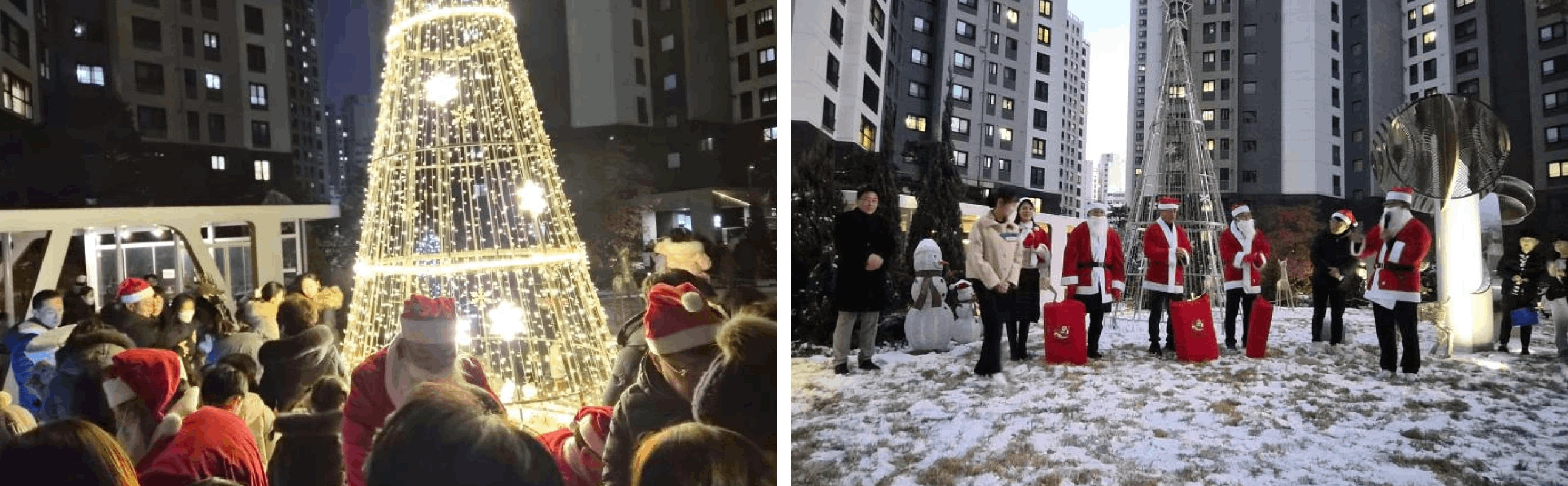 마포프레스티지자이의 겨울은 정말 풍성해요. 그 시작은 12월 5일, 단지 내 어린이집과 함께 ‘산타 잔치’ 콘셉트로 연 크리스마스 점등식이었습니다. 아이들이 캐럴을 부르고, 산타 복장을 한 어른들이 선물을 나눠줬죠. 카운트다운을 외치며 트리에 불이 켜지는 순간은 모두 동심으로 돌아간 듯 황홀했습니다. 이 밖에도 연말 기부 행사, 동짓날 팥죽 나눔을 했고, 수능 전날 수험생들에게 문고리 나눔으로 ‘서울대 문구 세트’를 전해주기도 했고요. 동 대표로서 다양한 문화행사와 이웃 간 함께 할 수 있는 프로젝트를 기획하는데, 오가다 만난 입주민들께서 기쁨과 감사를 아낌없이 표현해주셔서 많은 보람을 느끼고 있습니다. 커뮤니티에 올라오는 감사 댓글을 읽다 보면, 그날 하루가 유난히 따뜻해지죠.