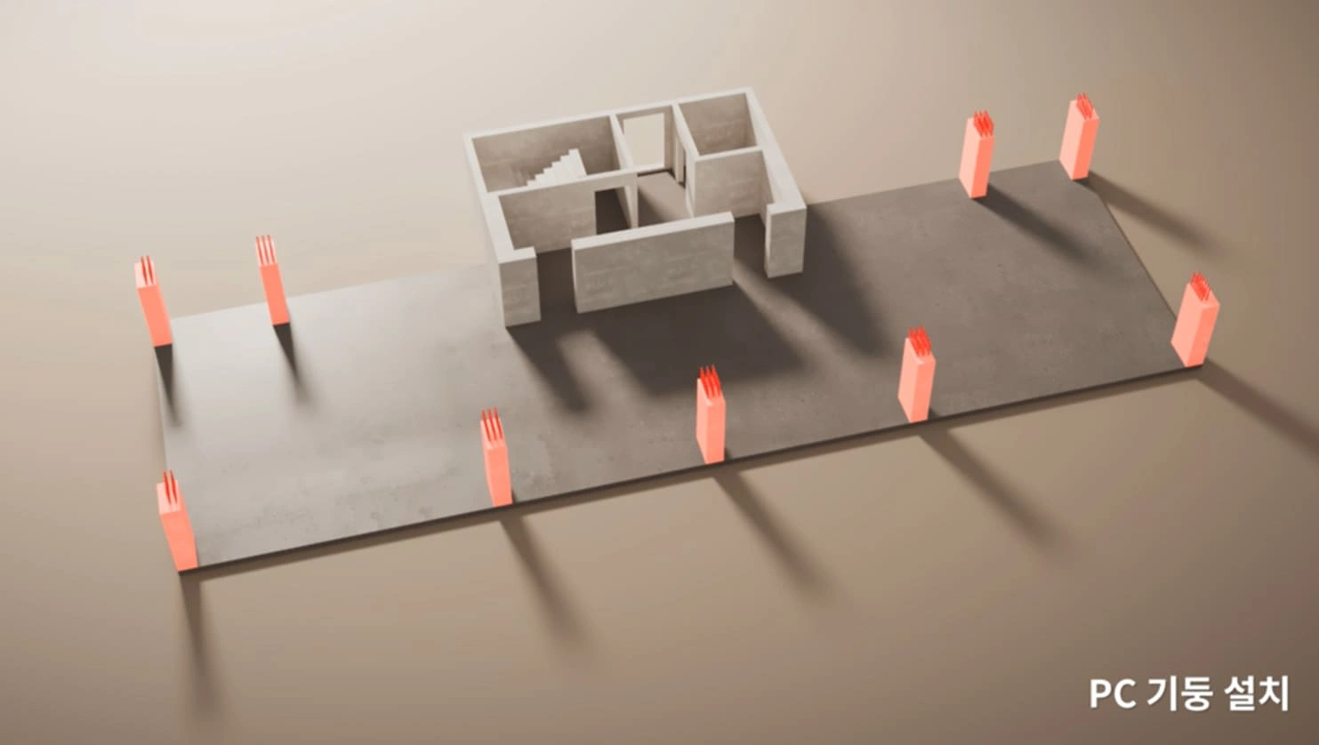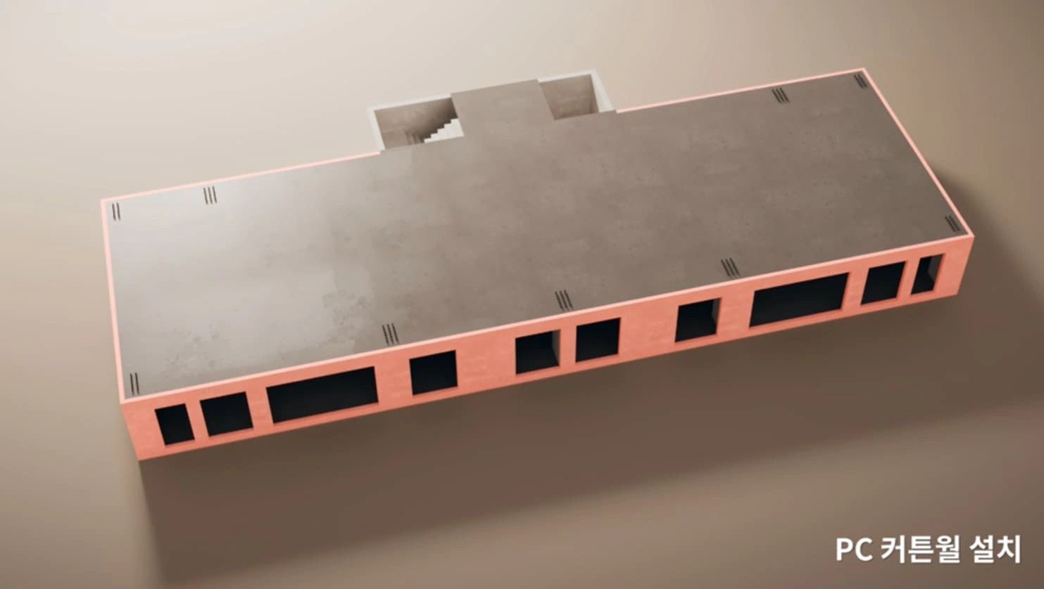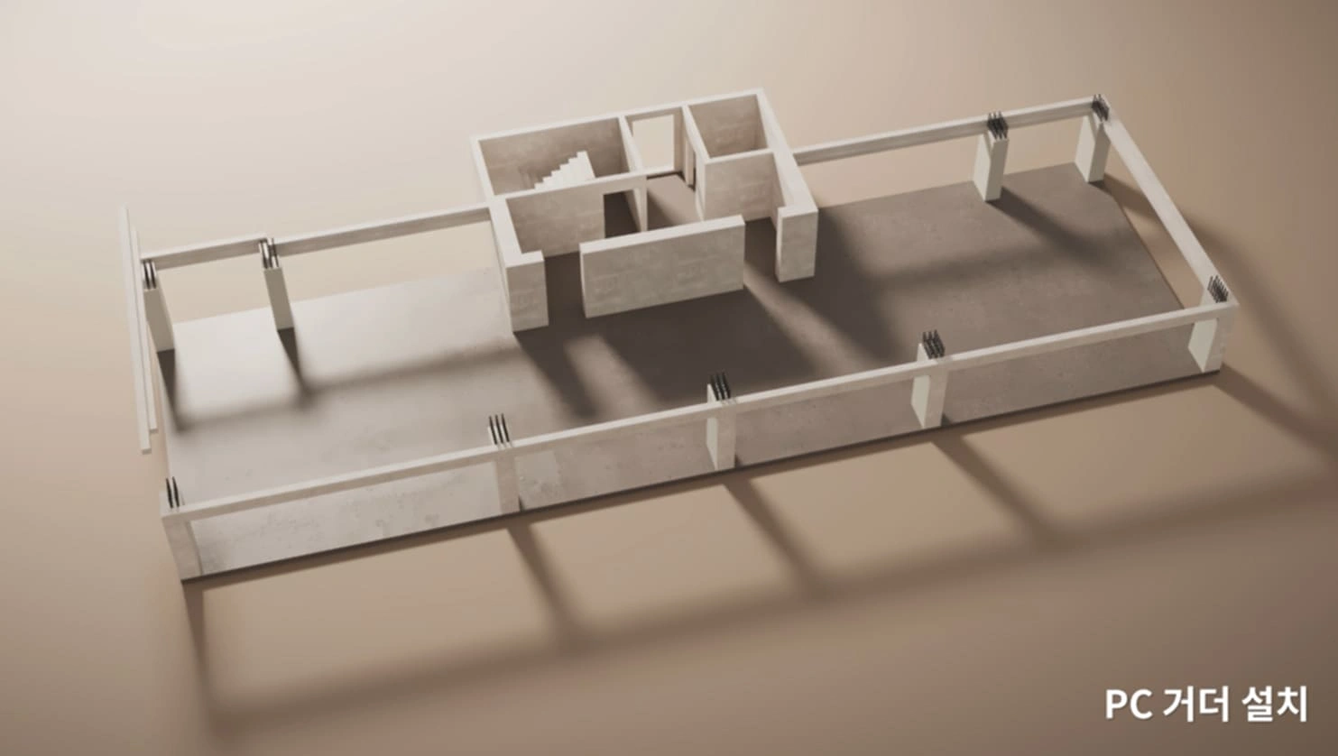 그럼에도 자이는 앞으로의 시대와 소비자에게 필요한 주거를 제시하기 위해 과감한 전환을 시도했다. 자이의 PC 공동주택 목업동은 벽식이 아닌 기둥식 구조를 적용함과 동시에, 공사 방법으로 탈현장 공법인 PC 공법을 실험한 사례다. 탈현장 공법이란 현장에서 콘크리트를 타설하는 재래식 공법과 다르게 공장에서 구조 부재(기둥, 보 등)를 사전 제작하고 공사 현장에서 조립하는 방법으로, 그 중에서도 PC(Precast Concrete) 공법은 콘크리트로 된 구조 부재를 공장에서 사전 제작하는 것을 뜻한다.