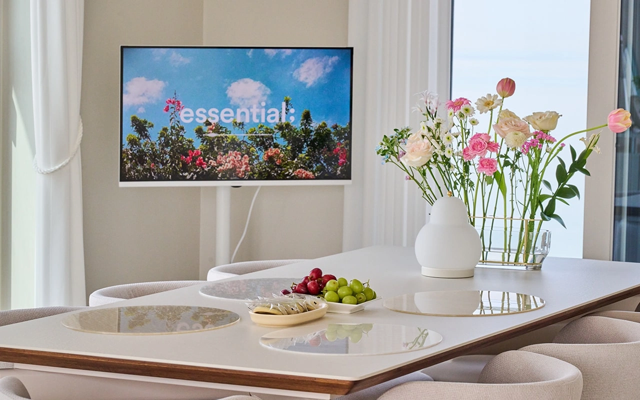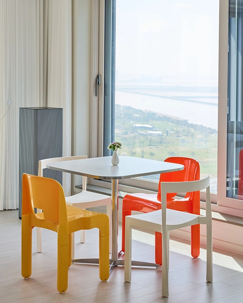 거실과 다이닝 뷰가 워낙 예쁘기 때문에 그 풍경을 해치지 않는 것도 중요했어요. 소파는 자유롭게 배치할 수 있는 모듈형으로 골랐고, 다이닝 의자도 식탁과 세트로 구성된 제품 대신 등받이가 낮은 것을 선택해 창밖 뷰를 가리지 않도록 했어요. TV는 안방에 두고, 다이닝 공간에는 이동식 스탠드 TV를 두어 시선이 한 곳에 머물지 않고 공간의 아름다움을 느낄 수 있도록 했어요.