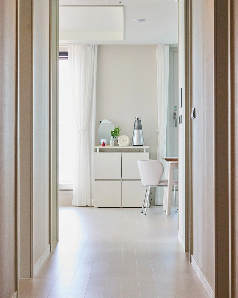 저희 집은 ‘ㄱ(기역)’자로 꺾이는 현관을 지나 복도 양쪽으로 방이 있고, 긴 복도 끝에 거실과 다이닝, 주방이 이어지는 구조예요. 공간이 분리돼 있어 각 방마다의 독립성이 보장되고, 현관에서 거실이 바로 보이지 않는 구조라 프라이버시를 보호받을 수 있다는 점이 마음에 들어요.