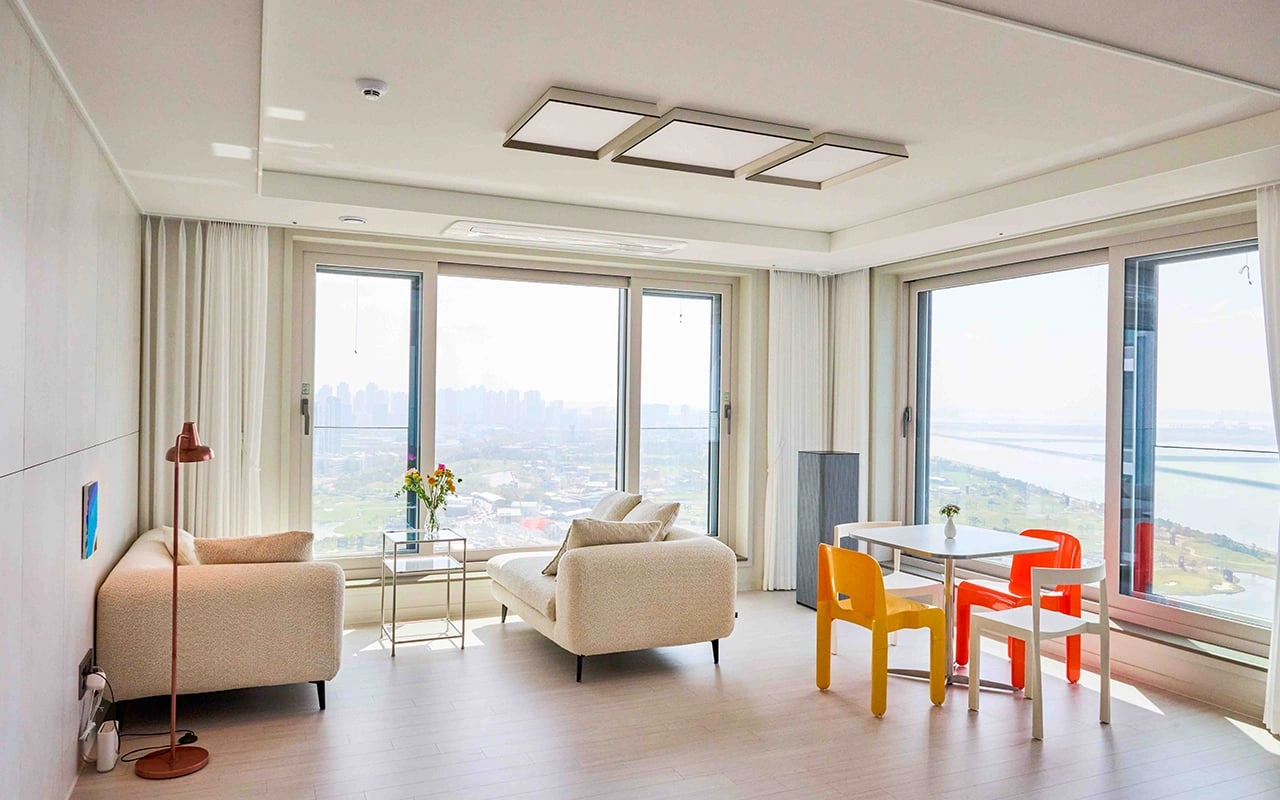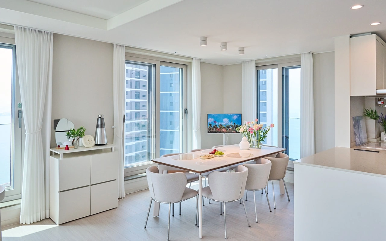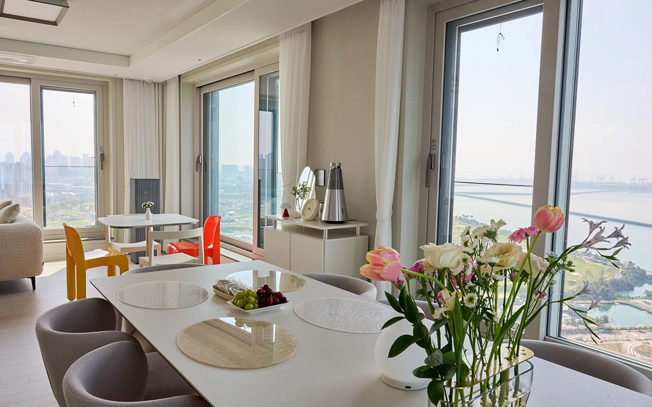 저희 집의 가장 큰 장점은 하루 종일 집안 곳곳을 따뜻하게 비추는 ‘빛’이라고 생각해요. 그 중 오션 뷰와 시티 뷰를 모두 갖춘 거실은 제가 가장 공들인, 그만큼 애정이 깊은 공간입니다. 인테리어를 고민할 때 가장 먼저 세운 원칙은 전체적으로 모던하면서도 따뜻한 분위기를 만드는 것이었어요. 화이트와 무채색을 중심으로 차분하게 정리하되, 공간이 너무 차갑게 느껴지지 않도록 포인트 컬러가 돋보이는 소품이나 패브릭, 식물, 그림 등으로 따뜻한 무드를 더했습니다.