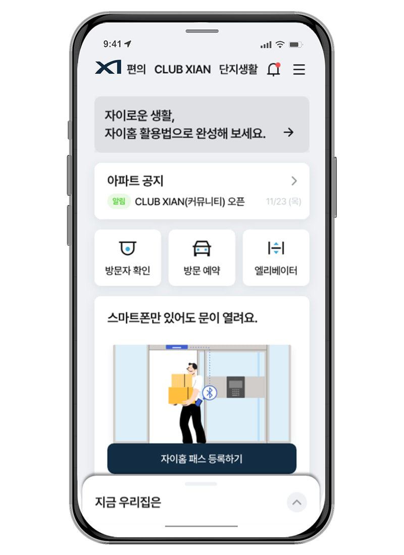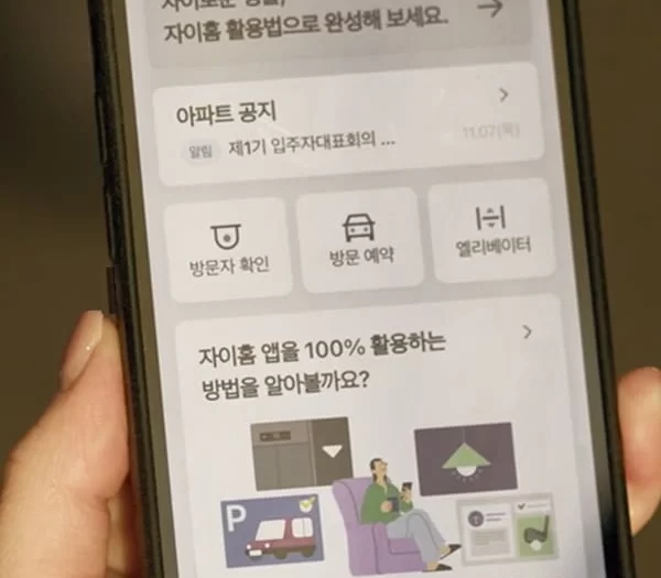 또, 집을 나서기 전에 우리 집이 있는 층으로 엘리베이터를 호출하는 것이나 내가 부재중일 때에도 가족들이 집에 돌아왔는지 방문 기록에서 확인할 수 있는 것은 앱을 사용할수록 만족도가 높아지는 기능이다. 아파트 생활을 더욱 편리하게 해주는, 입주민을 향한 세심한 배려가 담긴 기능들도 있다. 스마트폰만 가지고 있으면 공동 현관으로 들어설 때 별다른 조작 없이 동출입구가 자동으로 열리고 엘리베이터가 호출된다.