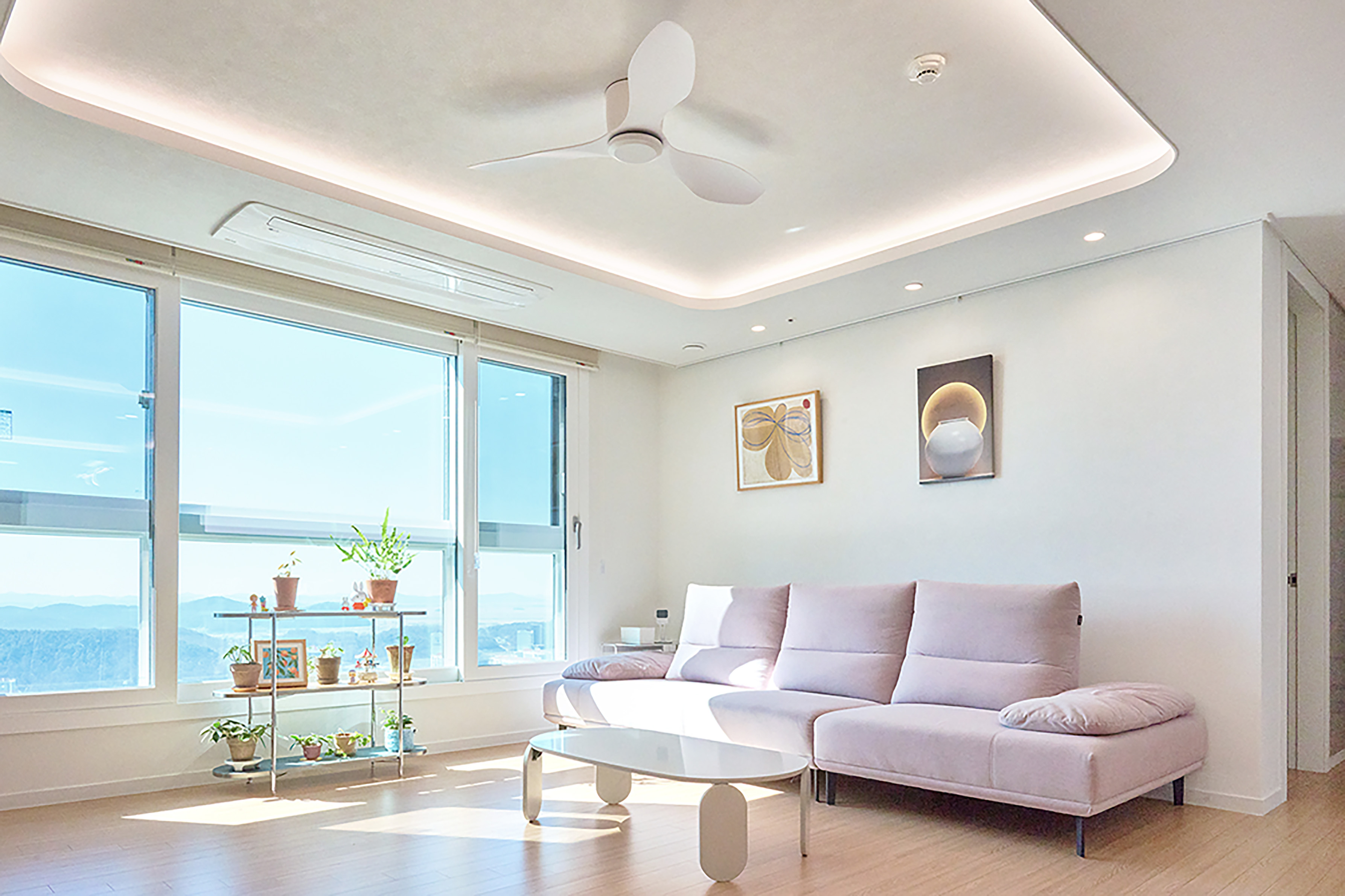 이사를 왔을 때 이미 공간이 충분히 마음에 들어서 최소한의 인테리어만 하기로 했어요. 벽지, 필름 시공, 그리고 천장에 설치한 실링팬과 우물천장이 시선을 위로 끌어올려 주는 덕분에 거실의 공간감과 인테리어 완성도가 한층 높아졌어요. 열흘 정도의 짧은 공사였지만 집 분위기가 확 달라져서, 지금은 결과에 아주 만족하고 있어요.