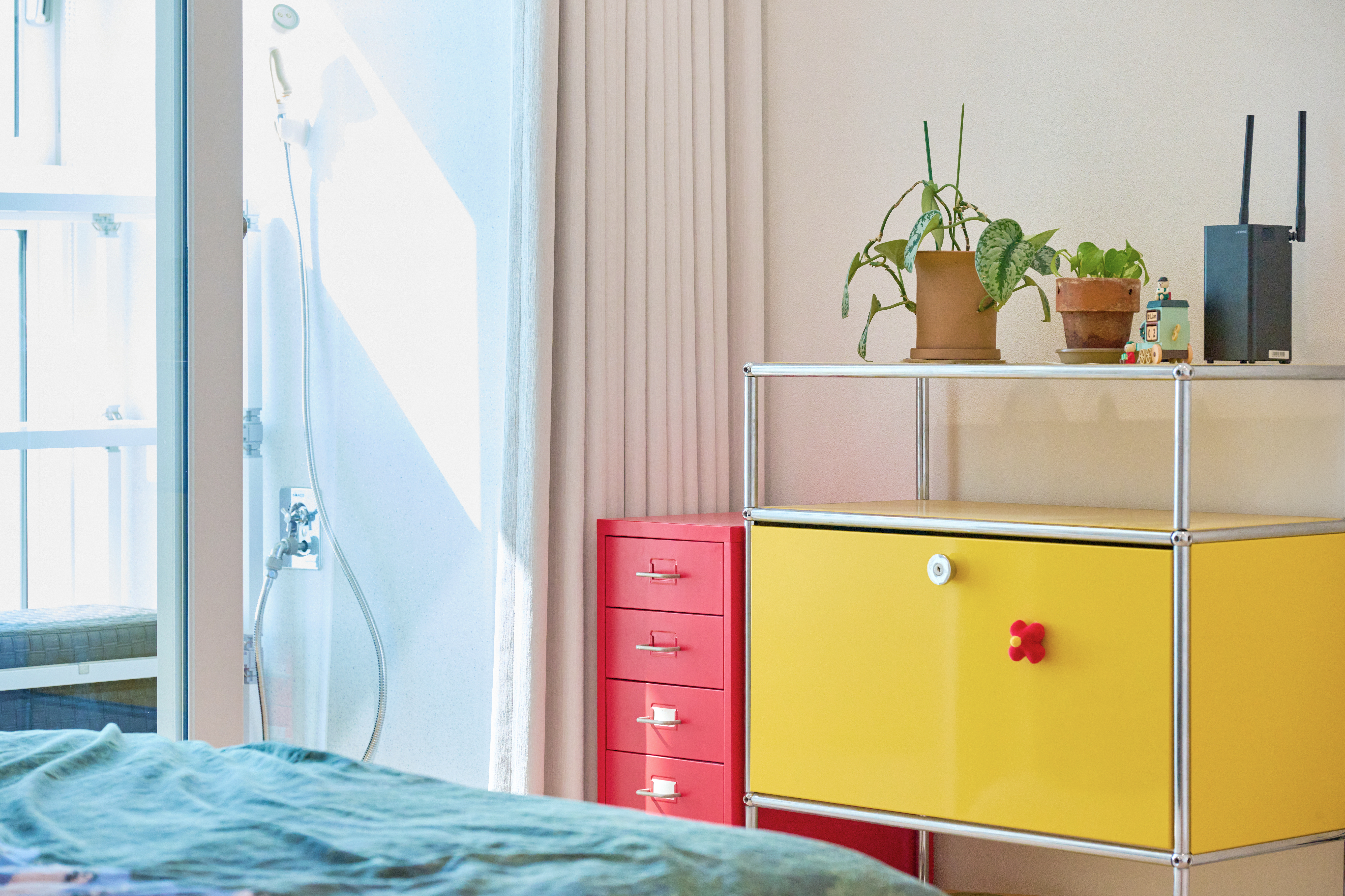제가 키우는 식물들로 집 안에 그린 컬러 포인트를 주고 있어요. 투명한 유리 화병으로 수경재배하는 식물과 작은 화분들로 공간마다 생기를 더했어요. 또, 선반과 사이드 테이블 위에는 작은 피규어와 캐릭터 소품을 올려두어, 집 안 곳곳에서 가족들의 취향을 귀엽게 발견할 수 있게 했어요.