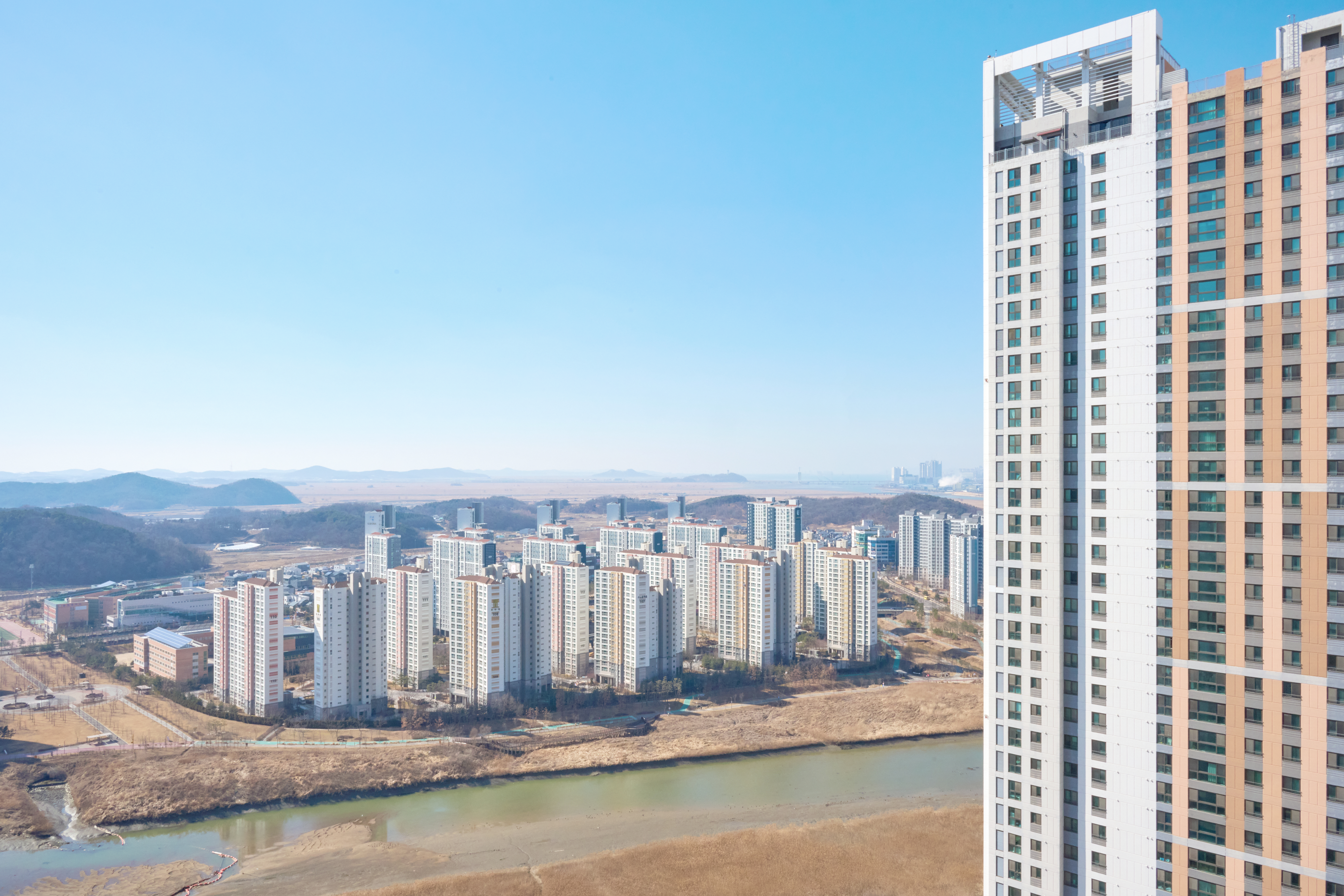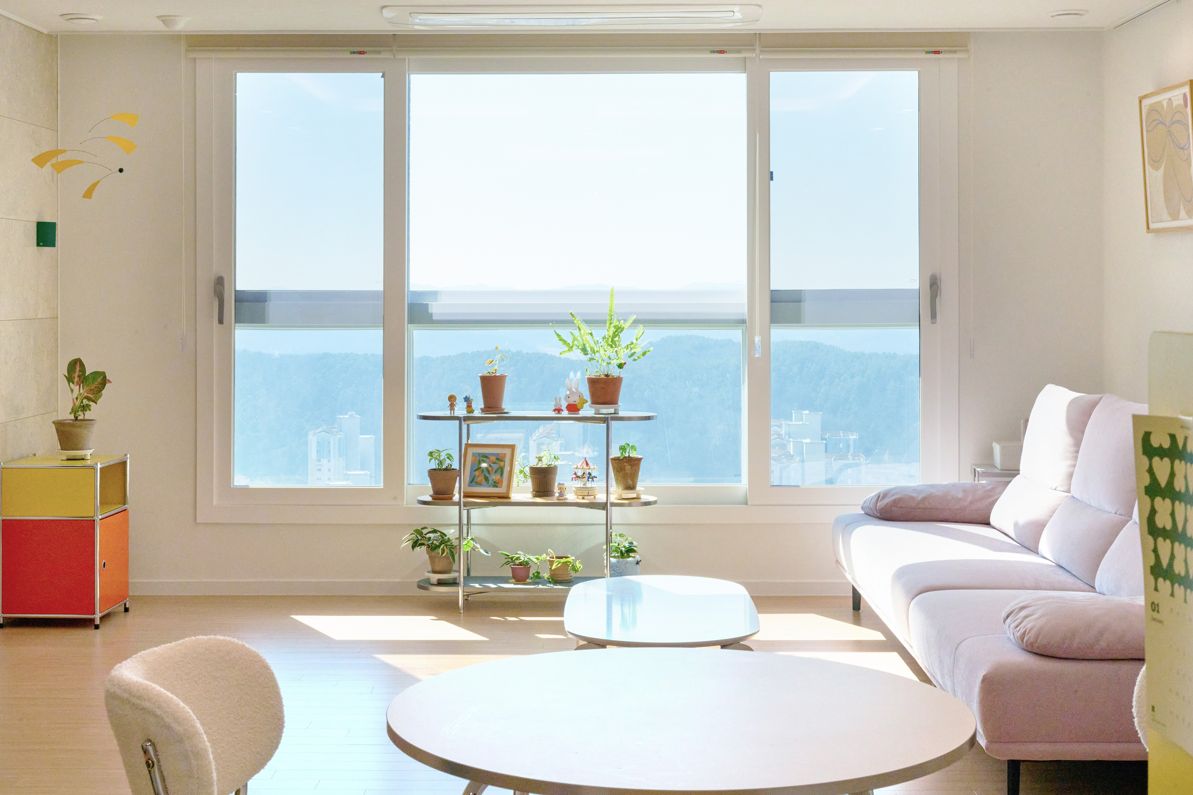 우리 집의 가장 큰 장점은 거실과 다이닝 공간 너머로 시원하게 펼쳐지는 풍경이에요. 자연광이 집 안 깊숙이 들어와 시간마다 다른 분위기를 만들어줘요. 창밖으로는 안산 갈대습지공원의 생태 연못이 보이고, 날이 좋으면 바다와 습지 너머의 산까지 한눈에 들어와요. 새해 첫 해돋이도 이곳에서 볼 수 있을 정도로 멋진 뷰가 매력적인 곳이에요.