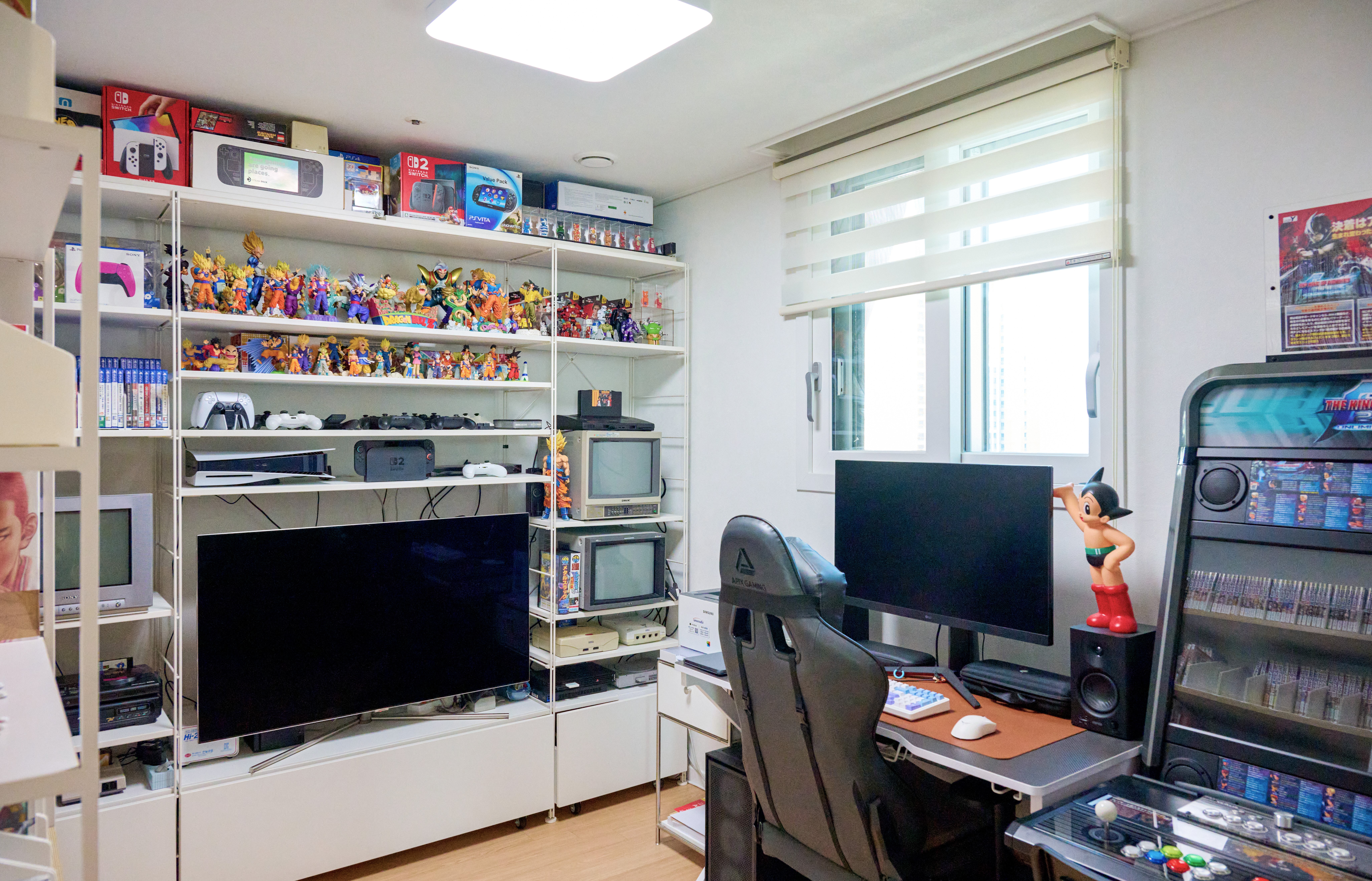 작업 공간에는 남편이 좋아하는 만화책과 게임팩, 피규어가 깔끔하게 정리되어 있어요. 남편은 모두가 꿈꾸는 취미방을 아주 정성스럽게 가꾸고 있어요. 저도 캐릭터를 좋아해서 작은 캐릭터 소품들이 집 안 곳곳에 놓여 있고요. 정돈된 집 안을 둘러보다 보면 우리 가족이 아끼는 것들과 취향이 자연스럽게 눈에 들어와요.