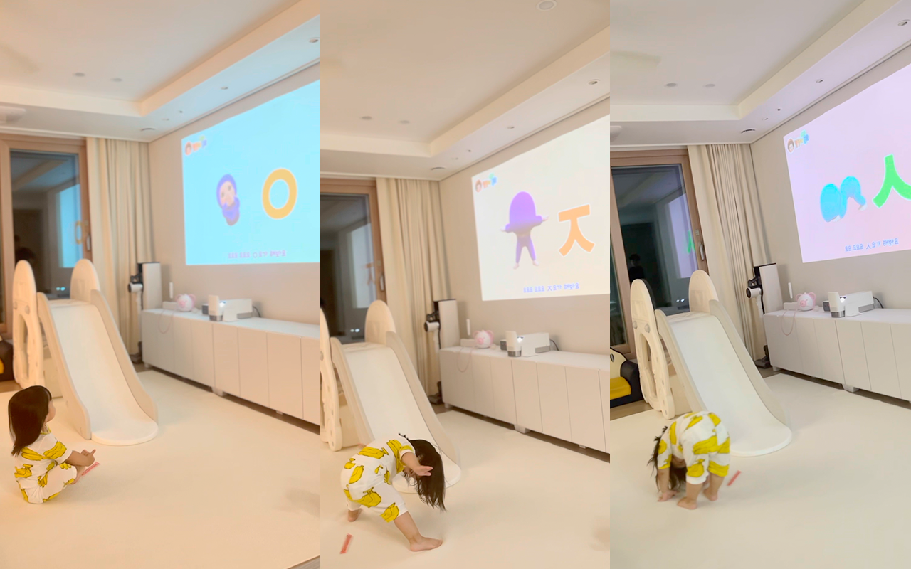 그리고 저희 집에는 TV가 없어요. 대신 거실 벽으로 빔 프로젝터를 이용해서 영상을 보는데 아이들은 재미있게 한글을 배우고, 남편이랑 저는 특히 저녁에 영화 볼 때 쓰는데 너무 만족해요.