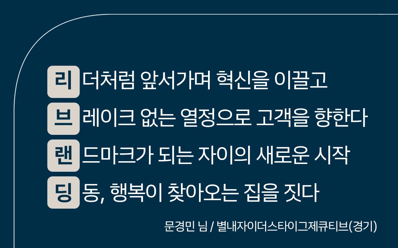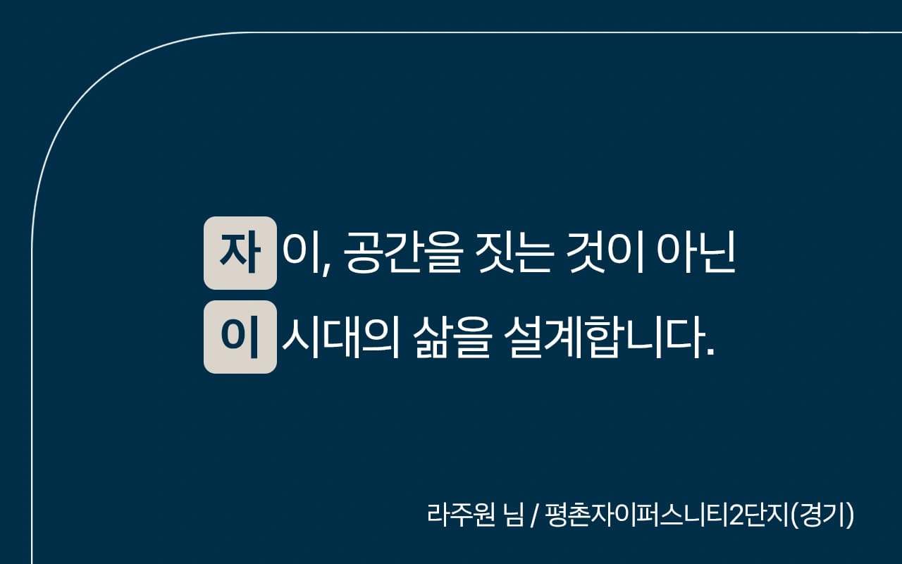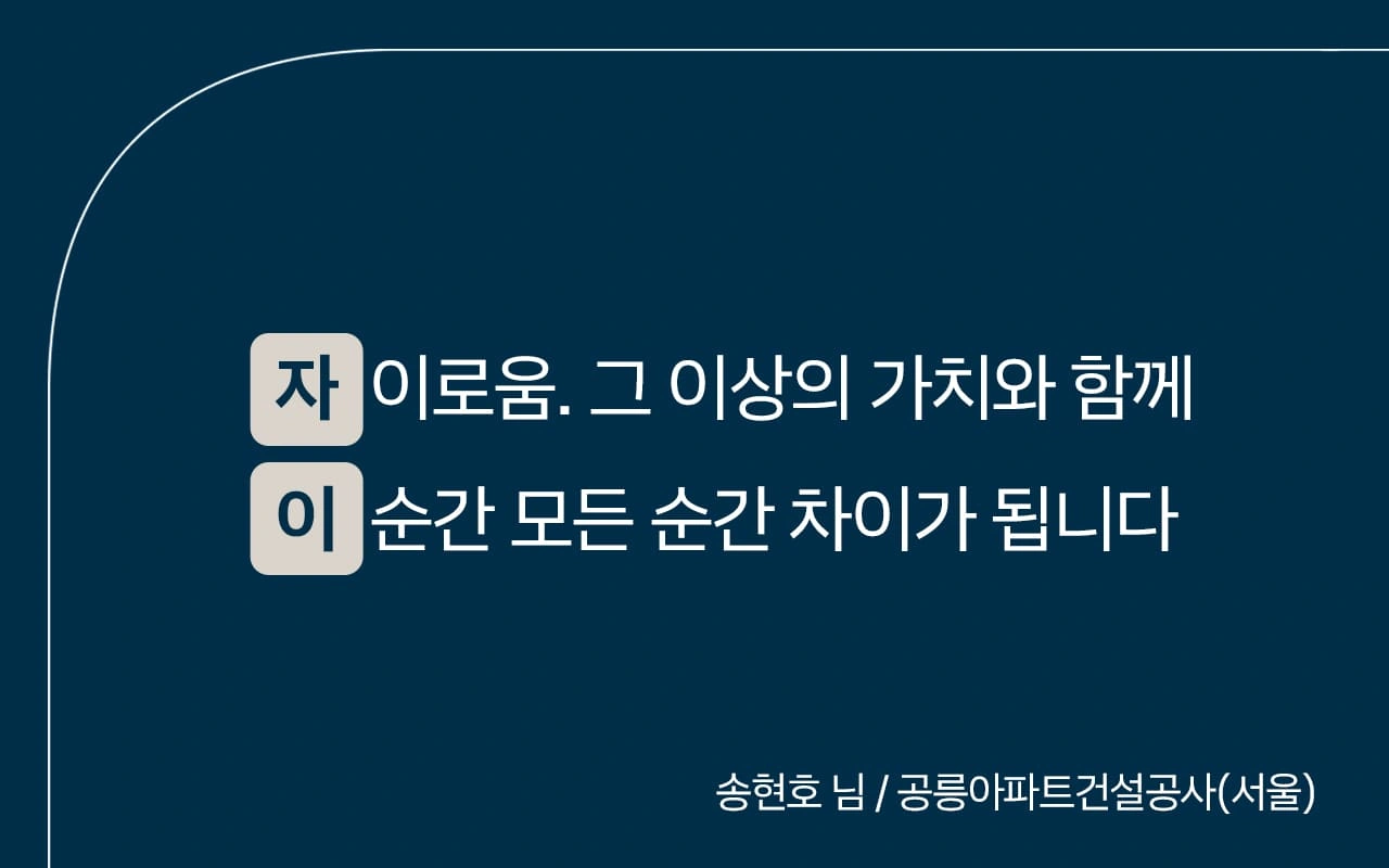 “자이에 장모님께서 입주해서 살고 계세요. 공사를 할 때 동료들과 열정을 다했었는데, 이제는 자이가 단순한 건물이 아니라 제 삶의 터전이 되는 경험을 했어요. 우리 손으로 만들어진 공간에서 가족들이 행복하게 살아가는 모습을 보며 큰 보람을 느낍니다. 이 경험을 담아 이번 N행시에 참여했어요. 회사와 고객 모두의 입장에서 진심을 담아 표현하고 싶었습니다.”