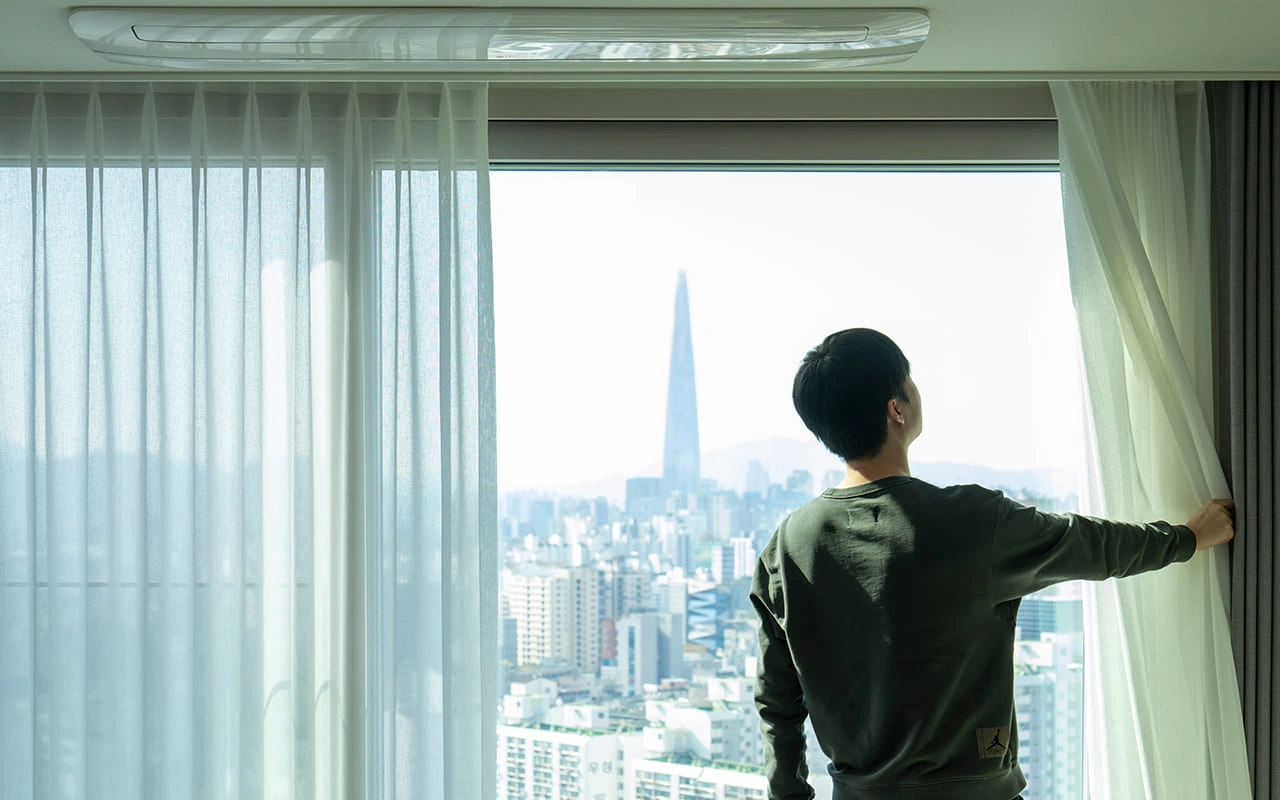 처음 사전 점검을 왔을 때 가장 마음에 든 점은 뷰였습니다. 창문을 열자마자 정말 ‘헉!’ 소리를 냈거든요. ‘서울에서 이렇게 막힘없이 탁 트인 뷰를 즐길 수 있는 데가 얼마나 될까?’ 제가 정말 운이 좋다는 생각이 들었습니다. 특히 저희 집 거실은 해가 지는 시간부터 야경으로 넘어갈 때까지의 분위기가 정말 환상적이에요. 그래서 거실에서 시내 전망을 바라볼 수 있는 이 자리를 가장 좋아합니다.