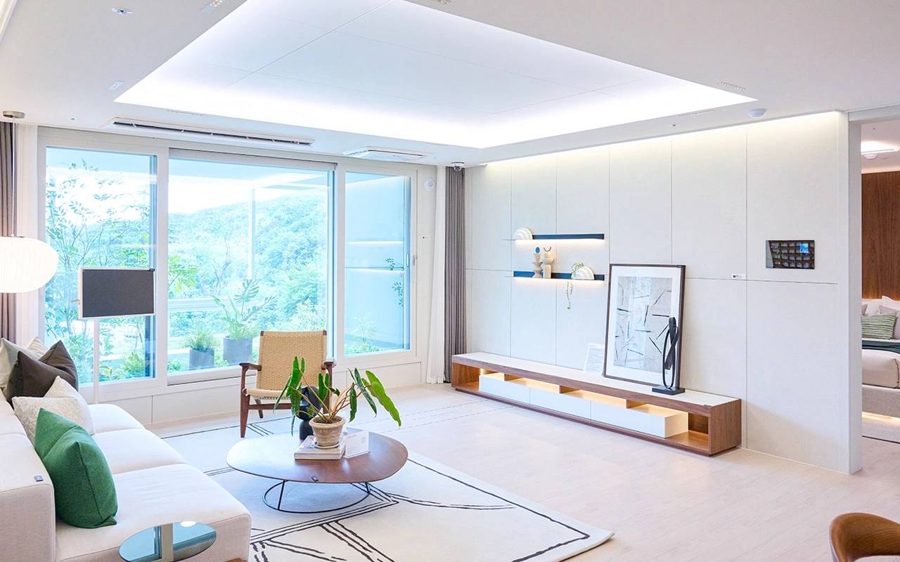 인테리어 Style Up 옵션으로 거실에는 이탈리아산 포세린 타일 벽과 천장 건축화 조명, 리니어 조명으로 공간에 감각을 더한다. 특히 지속 가능한 건축을 지향하고자 도입한 에너지 절약형 조명은 마이너스 몰딩 디자인과 매립형 구성으로 디자인적 완성도를 높이고, 집중모드, 휴식모드, 일상모드 등으로 색 온도를 조정할 수 있게 하여 생체 리듬의 안정화에 도움을 준다.