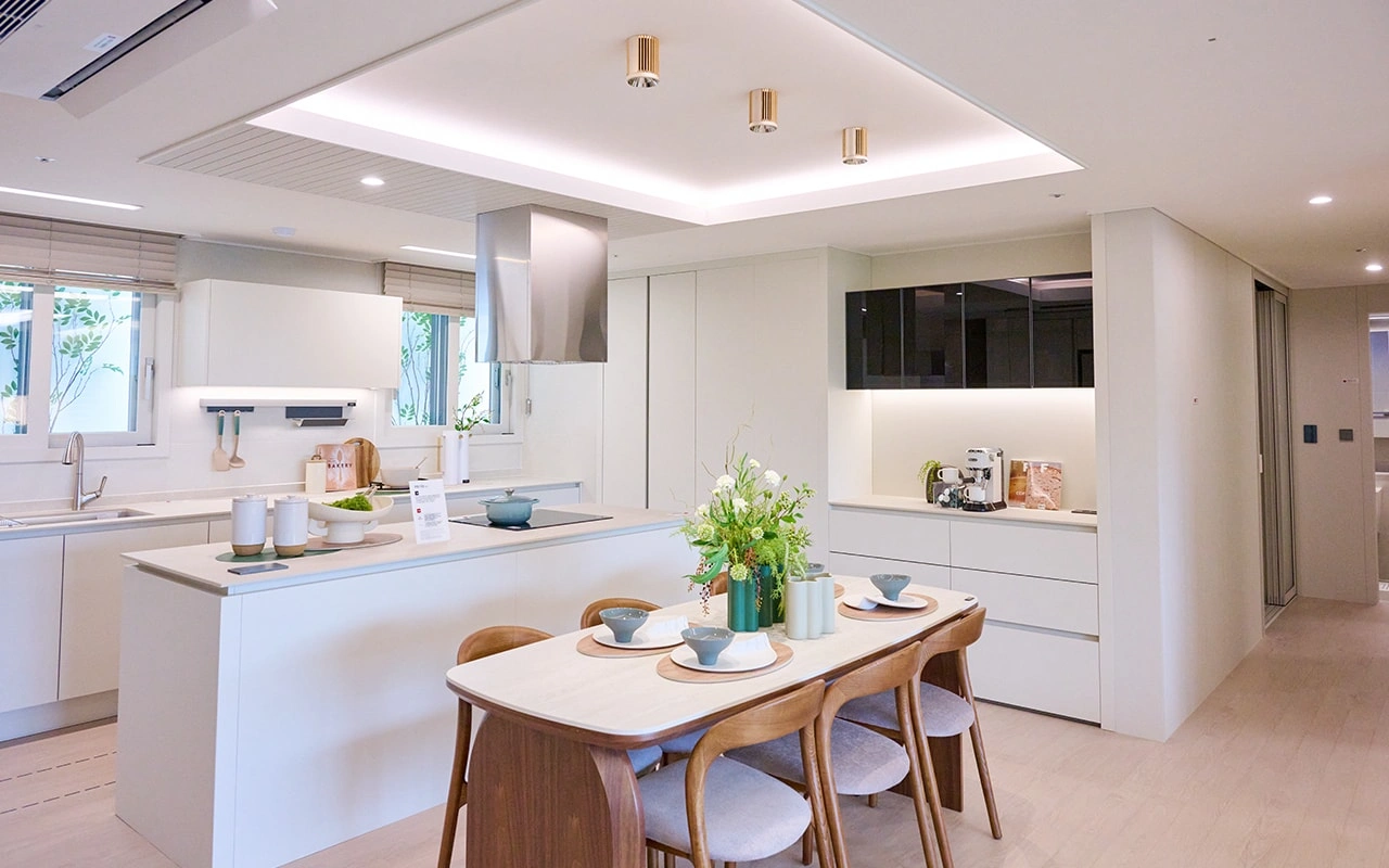 84㎡ 타입 주방은 알파룸을 확장해 넓은 다이닝 공간을 확보하고, 우물천장과 간접조명으로 공간을 보다 여유롭게 경험할 수 있도록 한다.