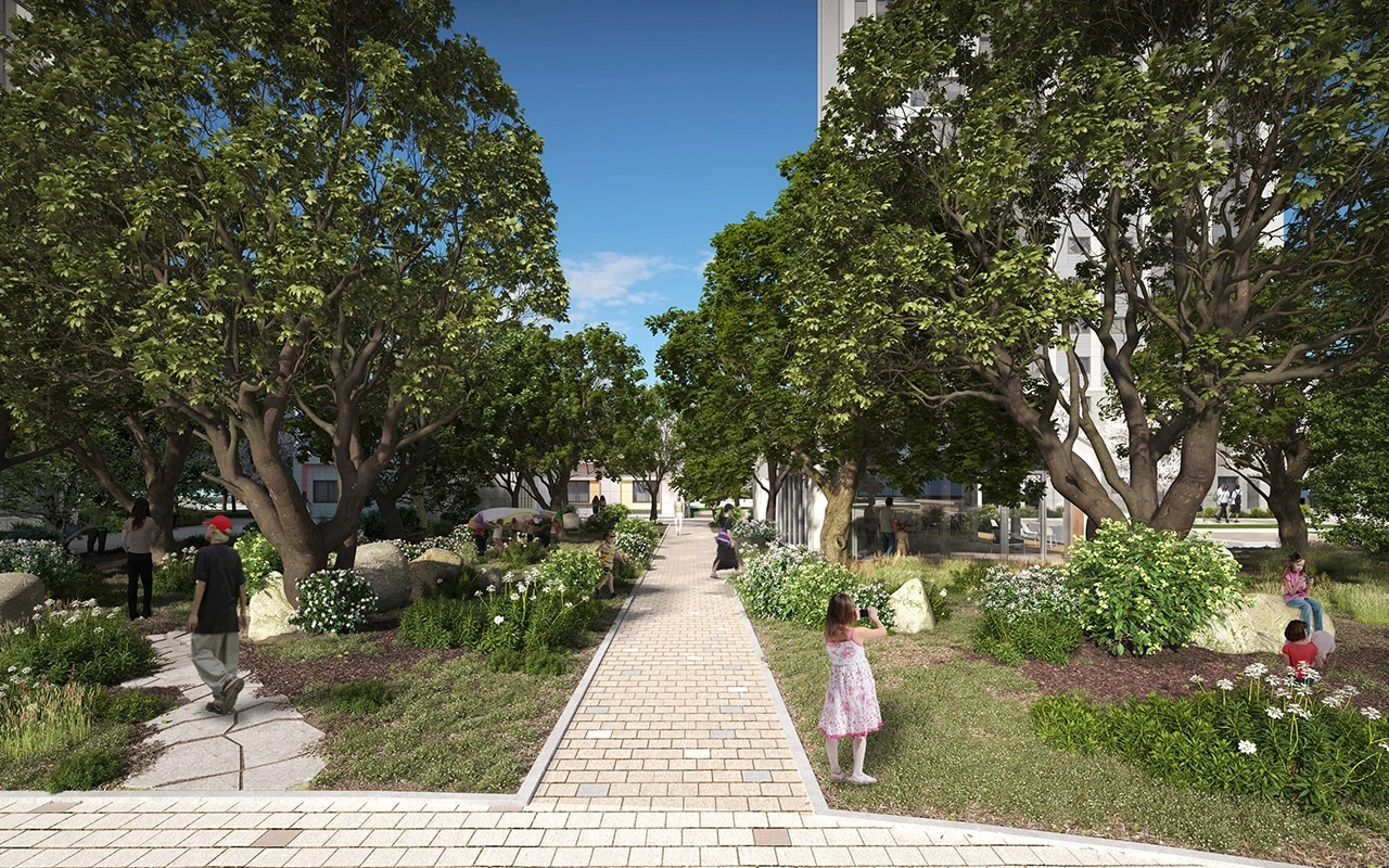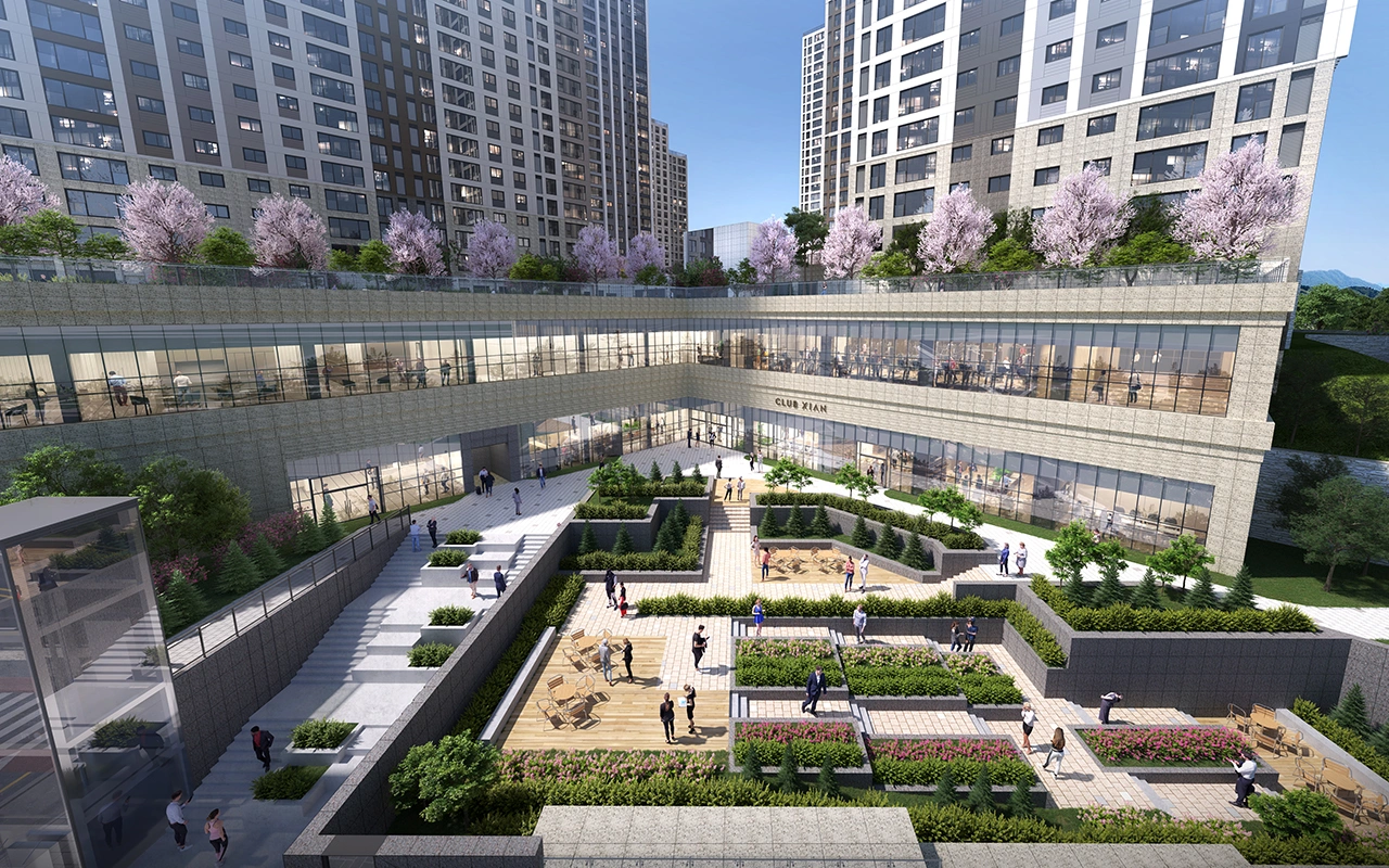 단차를 극복하는 과정에서 생긴 하나의 벽은, 단차를 두고 식재 경관을 조성하여 입주민에게는 탁 트인 전망을 누릴 수 있는 공간으로 기능하고 단지를 지나치는 이들에게는 열려 있는 도심 속 정원을 경험할 수 있도록 계획했다. 고객을 향한 자이의 고민이 담긴 결과로, 하나의 벽으로 남을 수도 있었을 공간이 의미 있는 전환점을 맞아 입주민과 도시를 살아가는 이들에게 단지의 상징적인 장소로 완성될 것이다.
