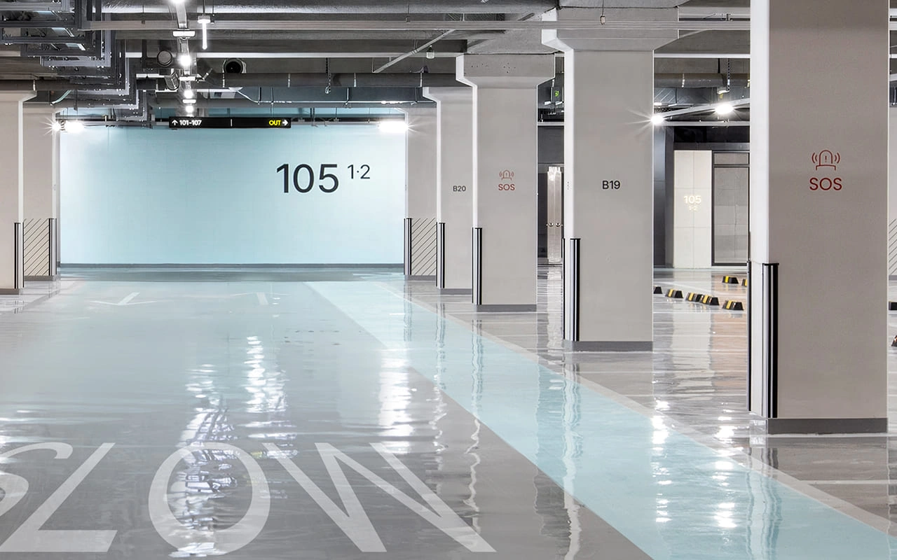 일관된 경험이 유지되도록 지상 공간과 지하 주차장의 사이니지를 일체화 하는 것은 물론, 나아가 지하 주차장의 사이니지는 보행자에게 안전한 계획이길 의도했다. 그리고 사이니지를 단순히 ‘길을 찾는 표식’이 아니라 공간의 분위기와 정서를 함께 설계하는 요소로서 바라보았다. 문라이트(MOONLIGHT)는 그런 철학이 담긴 디자인이다.